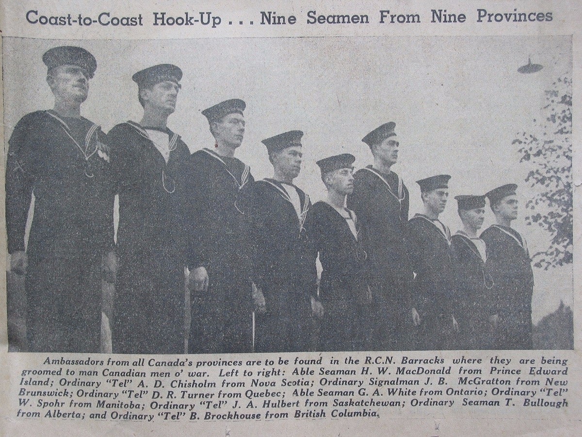 (2) Coast-to-Coast Hook-up . . . Nine Seamen From Nine Provinces. The Montreal Standard Newspaper November 4, 1939 Names of sailors in the article: (L-R) AB H.W. MacDonald from PEI; Ordinary Tel A.D. Chisholm from NS; Ordinary Sig J.B. McGratton from NB; Ordinary Tel D.R. Turner from Quebec; AB G.A. White from Ontario; Ordinary Tel W. Spohr from MB; Ordinary Tel J.A. Hulbert form Saskatchewan; OS T. Bullough from AB and Ordinary Tel B. Brockhouse from BC.