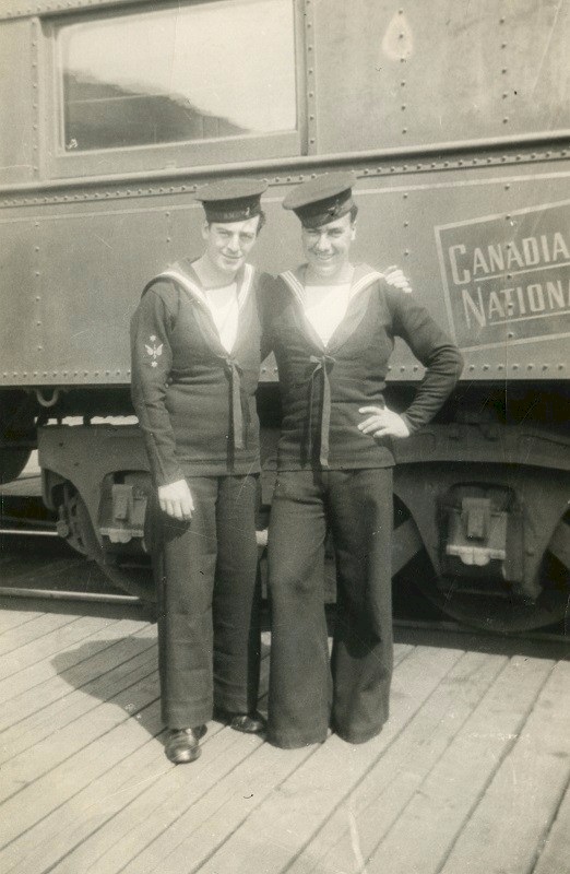 (3) John Hulbert (left) and his cousin Laurence (Laurie) Manuel waiting at the train station during the war