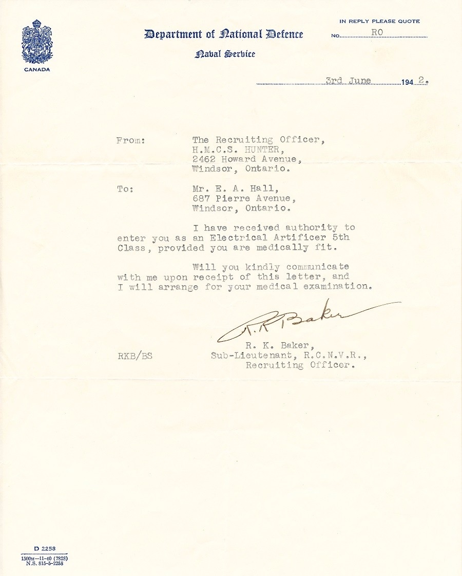 (1) Petty Officer Ervin Hall, Bristol, UK, Feb 1944 (2) Service Summary (3) Letter from the Recruiting Officer, HMCS Hunter to Ervin Hall, 03 Jun 1942