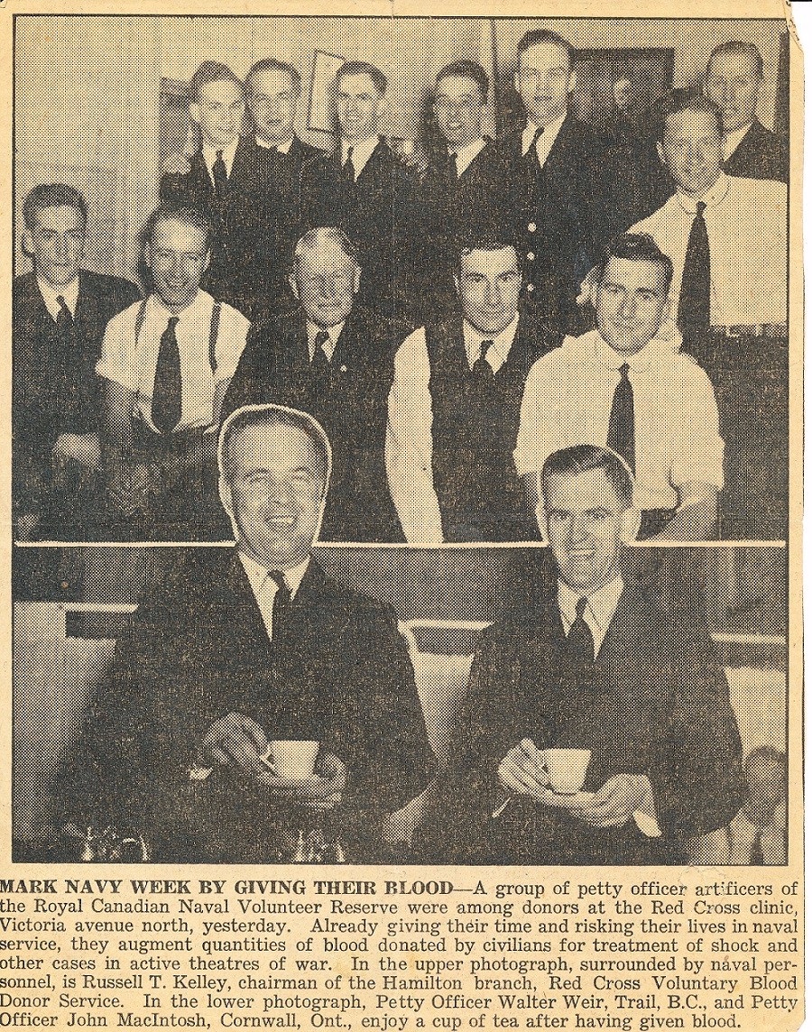 (4) Newspaper article on Petty Officers donating blood during Navy Week. The Hamilton Spectator 12 Aug 1942. Ervin Hall - Upper photo right side, middle, standing, white shirt.
