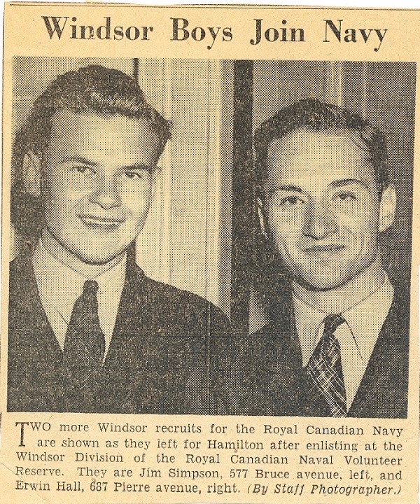 (5) Windsor Boys Join Navy. Newspaper article on Jim Simpson and Ervin Hall departing Windsor for Hamilton. The Windsor Star, Friday, 02 Aug 1942