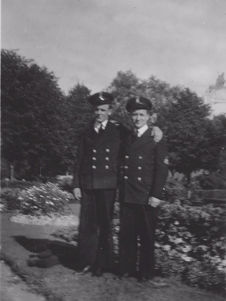(7) Petty Officer Ervin Hall, Bristol, England, Feb 1944 (8) Dave Coton, Yeoman of Signals (left) and Ervin Hall. "Two Salts or One Salt and a Half". Note the expanding front on Ervin.