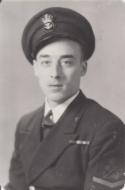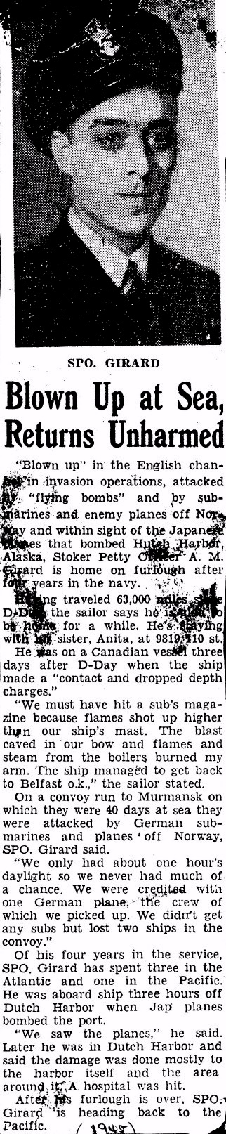 (1) Stoker Petty Officer Armand Girard (2) Stoker Petty Officer Armand Girard, Victoria, BC, 1942 (3) Stoker Petty Officer Armand Girard - 1944 (4) Newspaper article - SPO Girard, Blown Up At Sea, Returns Unharmed (5) Armand Girard - 1966 (6) Headstone for Armand Girard at a cemetery in Chauvin, AB Courtesy of Paulette (Girard) Collins