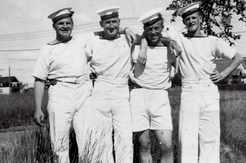 (FG001) Chris, Pop, Eric and Frank (FG002) Frank and his shipmates - ship unknown (FG003) Dorothy and Charlie Gilraine (Charlie was Frank's brother) (FG004)Frank Gilraine by the gun turret on HMCS CANSO - 1941 Courtesy of George Gilraine