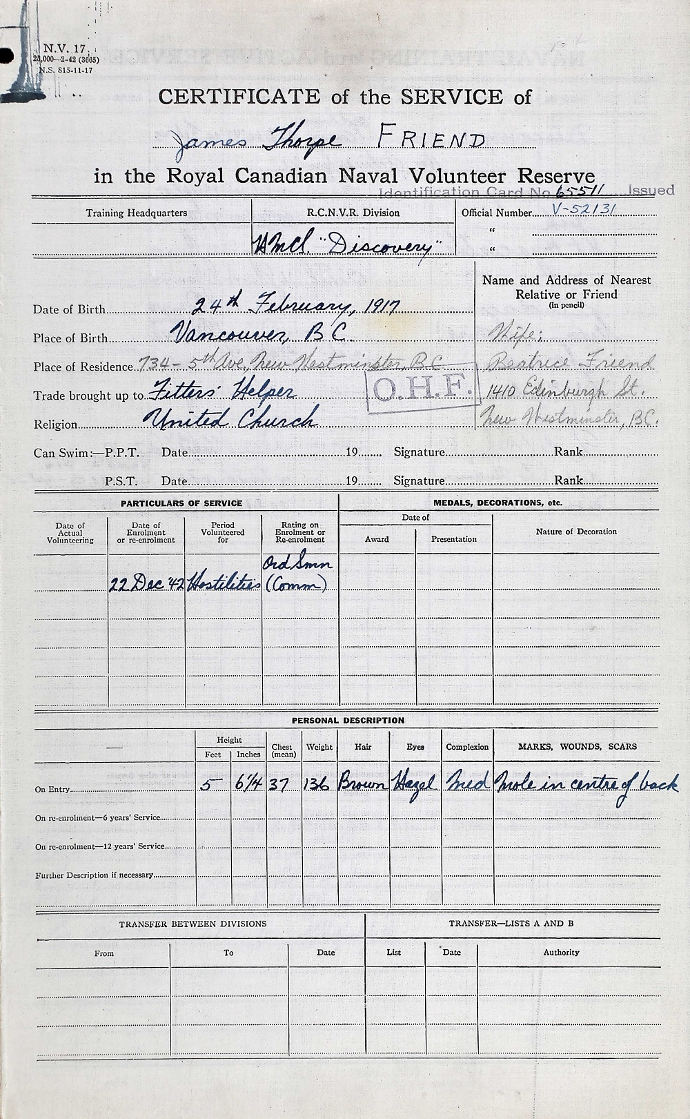 FRIEND, James Thorpe, Tel, V52131, RCNVR, killed - 11 Apr 1945, HMCS STRATHADAM - Son of John Walter and Maggie Friend; husband of Beatrice Elizabeth Friend, of New Westminster, BC.