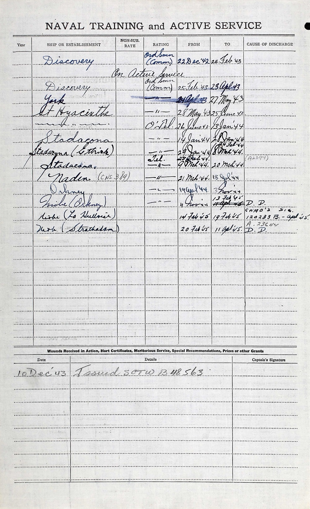 Ships served in: HMCS ETTRICK - Served in ETTRICK 29 Jan 1944 - 18 Mar 1944 as O/Tel & Tel, RCNVR. Rated Tel 25 Feb 1944 HMCS ORKNEY - Served in ORKNEY 19 Apr 1944 - 13 Feb 1945 as a Tel, RCNVR HMCS LA HULLOISE - Transferred (with Squadron Staff) to LA HULLOISE 14 Feb 1945 HMCS STRATHADAM - Transferred (with Squadron staff) to STRATHADAM 20 Feb 1945 - Killed 11 Apr 1945