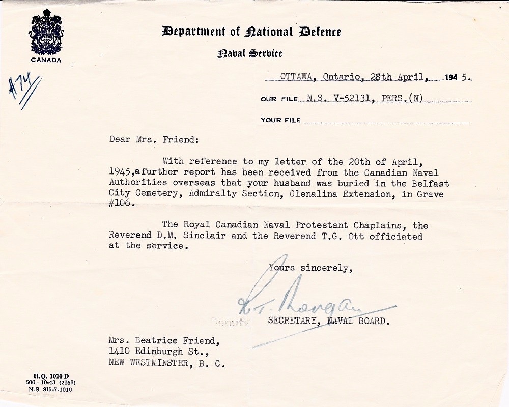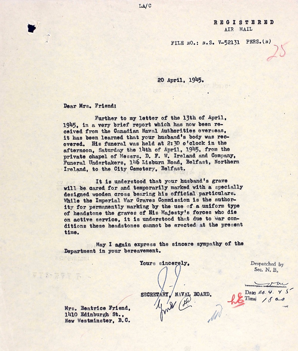 (JF06) Report of Death (JF07) Telegram to Tel Friend's widow informing her of his death (JF08-JF09) Letters informing Beatrice Friend that her husband was buried in the Belfast City Cemetery, Belfast, Northern Ireland (JF10) Newspaper article on casualties from HMCS STRATHADAM. From the Vancouver Daily Province, Sat, 09 Jun 1945
