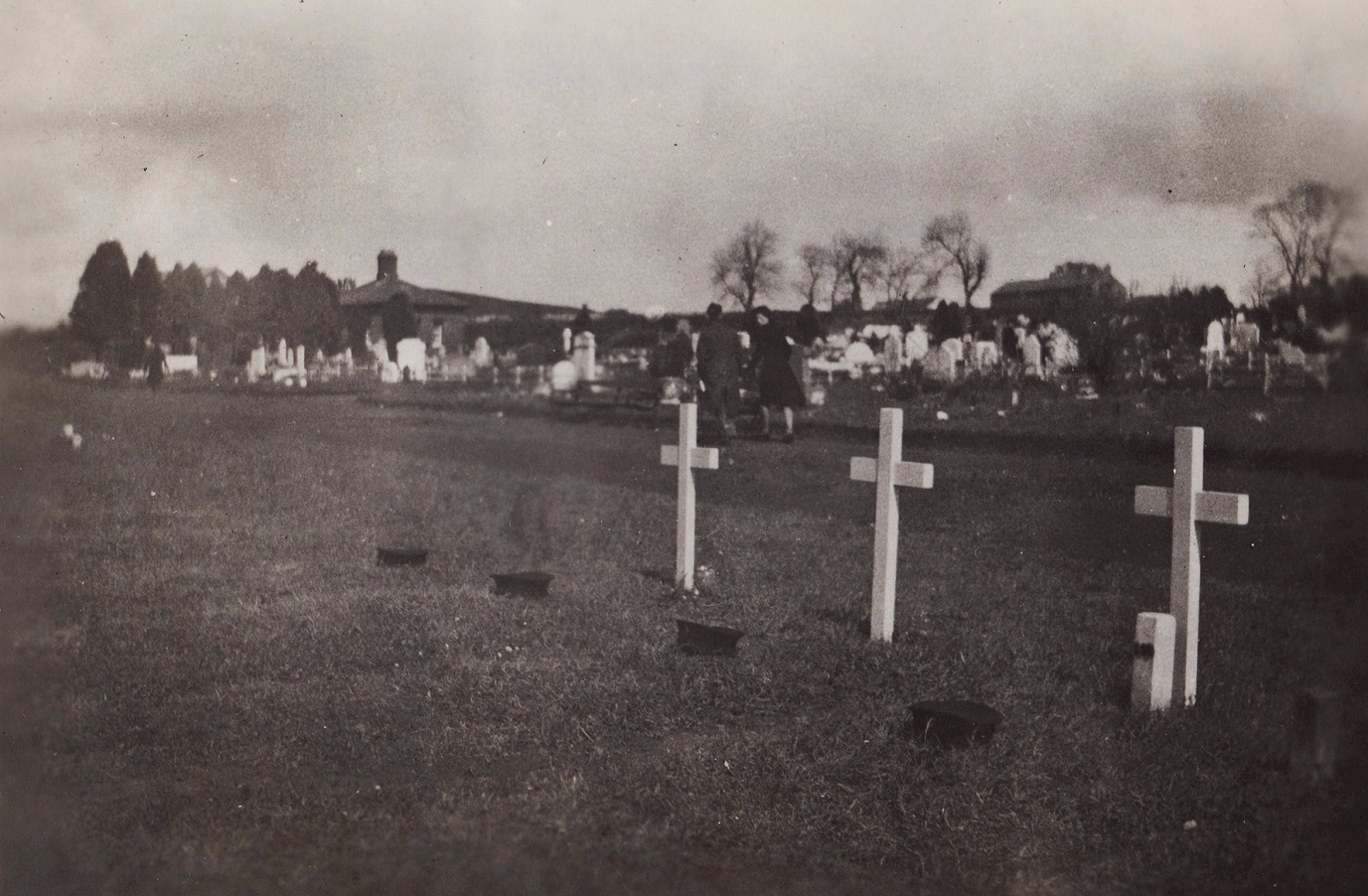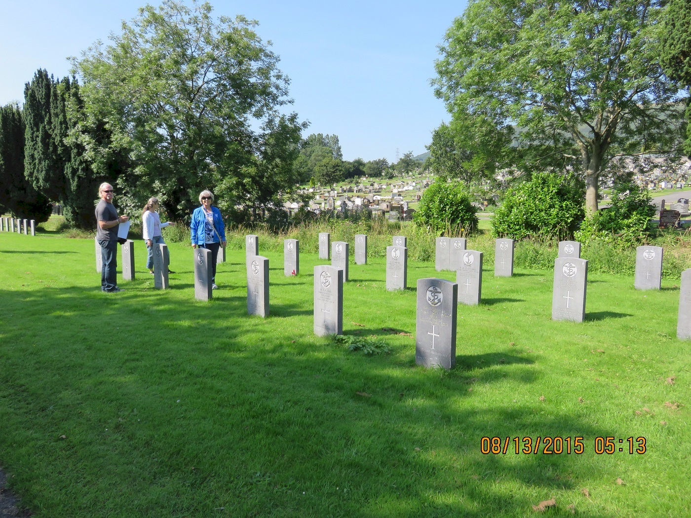(JF11) "Graves of three of our shipmates who were killed on HMCS STRATHADAM, 11 Apr 1945, when a hedgehog exploded during the attack on U-1302. Belfast City Cemetery, Belfast, Northern Ireland." Graves of Dennis McEwan, Jimmy Friend, Clifford Purdy - From the collection of Marcel Chasse (HMCS ORKNEY K448). Courtesy of Robert Chasse (JF12-JF13) In 2015, James Friend's daughter, Barbara Hamlin, visited her father's grave. This photo shows the Belfast City Cemetery 70 years later. Photo taken 13 Aug 2015