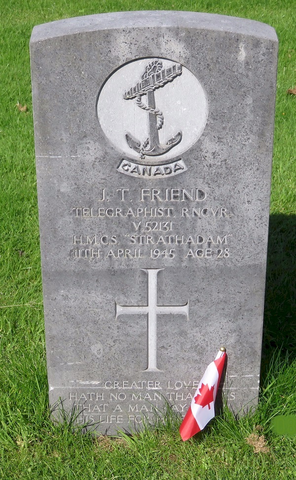 Telegraphist J. T. Friend was one of six members of the crew of HMCS STRATHADAM killed by a premature Hedgehog explosion on board. He was with the squadron staff and had recently transferred to HMCS STRATHADAM from HMCS LA HULLOISE with the squadron staff. He was killed on 11 Apr 1945 during an attacked on a suspected U-boat when a Hedgehog exploded on firing, killing 6 men. During almost two years of sea duty he did patrol duty in the North Atlantic and out of Bermuda. He was buried in Belfast City Cemetery, Belfast, Northern Ireland on 14 Apr 1945. He was survived by his parents John Walter and Maggie Friend, his wife Beatrice Elizabeth Friend and his two year old daughter Barbara.