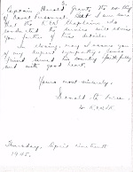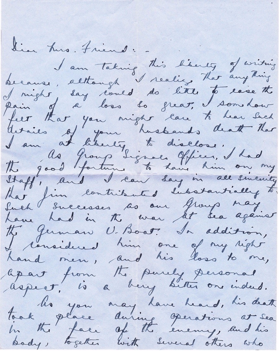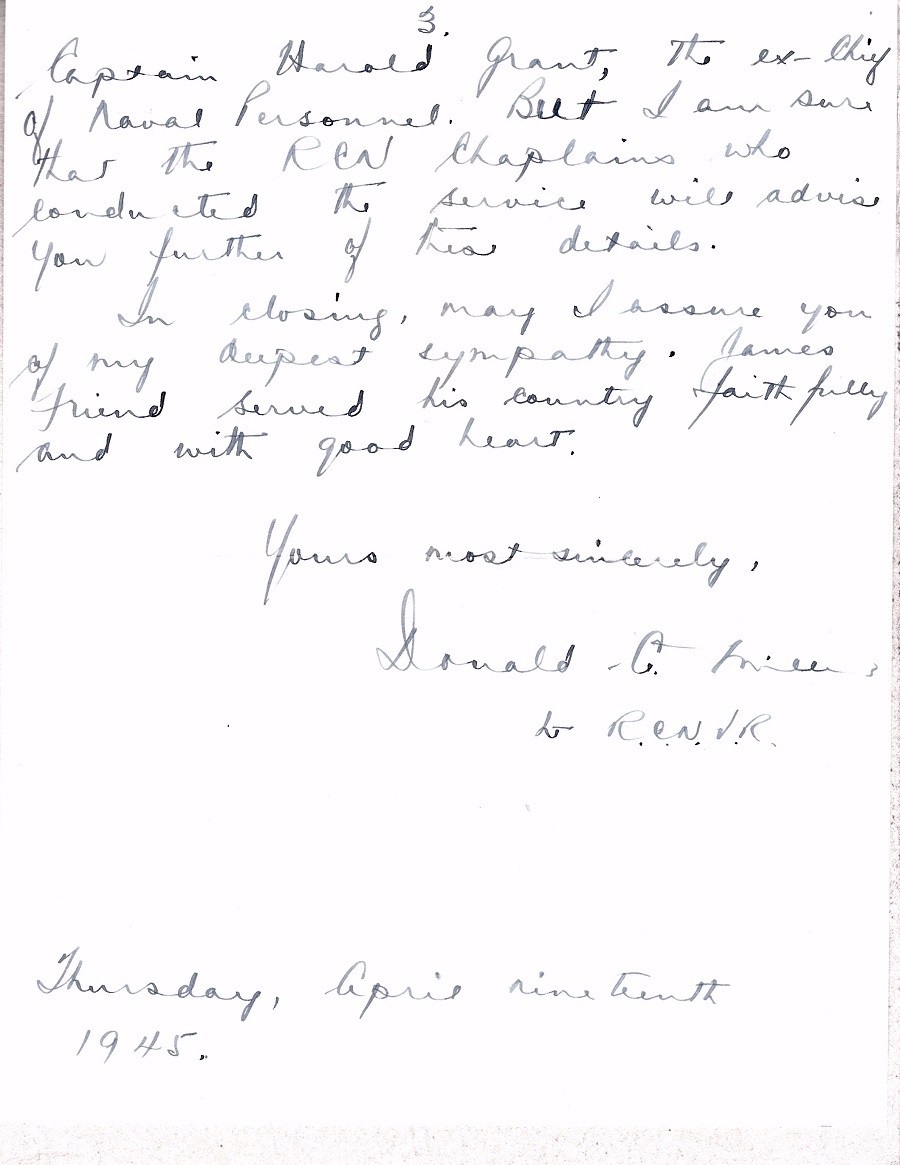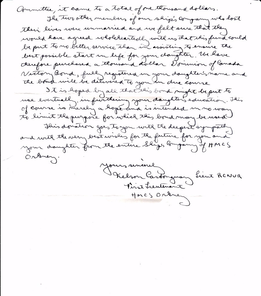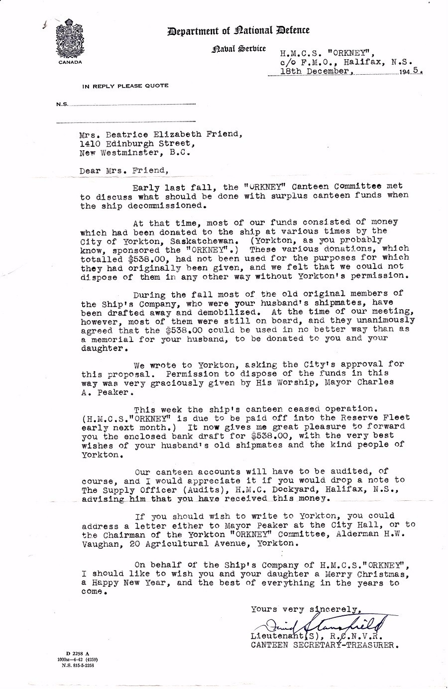 (JF10-JF20) Letter from Lt Nelson Jules Castonguay, RCNVR, 1st Lt, HMCS ORKNEY to Beatrice Friend expressing sympathies on behalf of the crew of HMCS ORKNEY and informing her that the crew of HMCS ORKNEY took up a collection and used their canteen fund as well to purchase a $1000 war bond in the name of their daughter Barbara to go towards her future. (JF21) Letter from Lt (S) David Standfield, RCNVR, HMCS Orkney to Beatrice Friend with a cheque for $538 from the surplus canteen funds of HMCS ORKNEY (as she is being paid off) in memory of her husband, James Friend, who was killed on HMCS STRATHADAM.