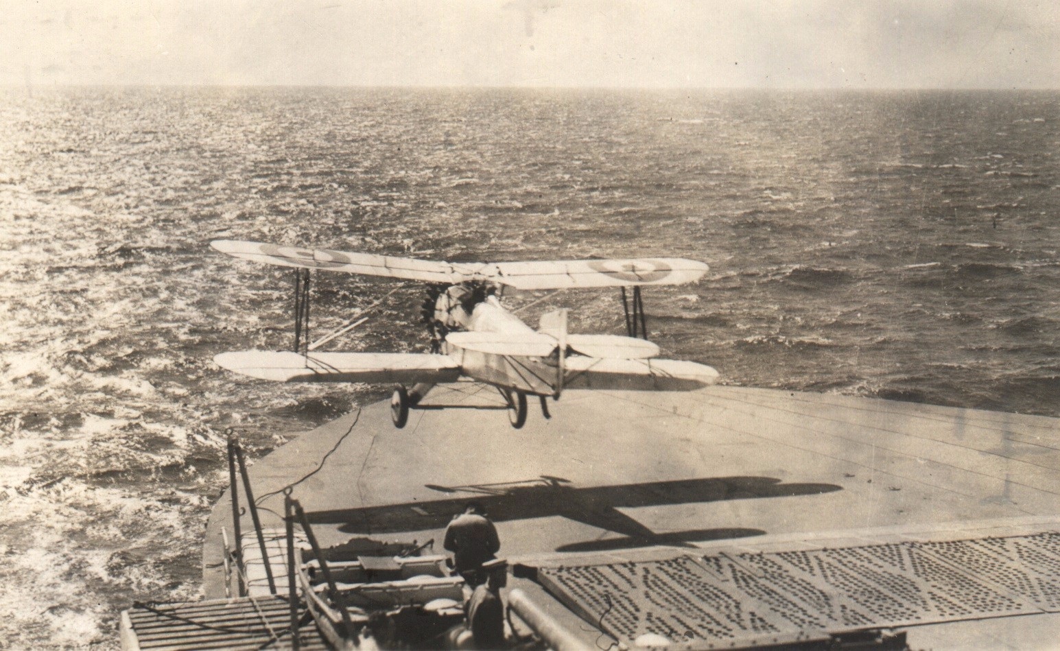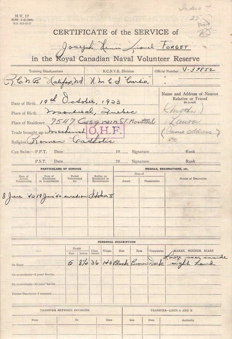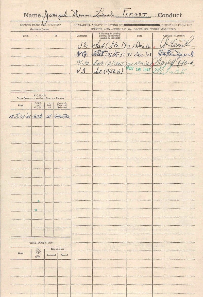 (1) Certificate of Service (2-3) Naval Training and Active Service record (4) Conduct record (5) Joseph Henri Lionel Forget - Sep 1942 (6) Unknown aircraft Carrier (7) Sailors on parade, marching of out of HMC Dockyard (8) Bi-plane taking off from unknown carrier