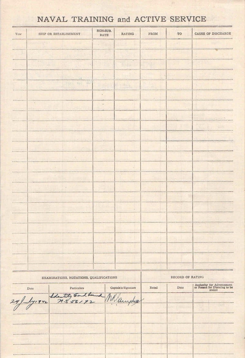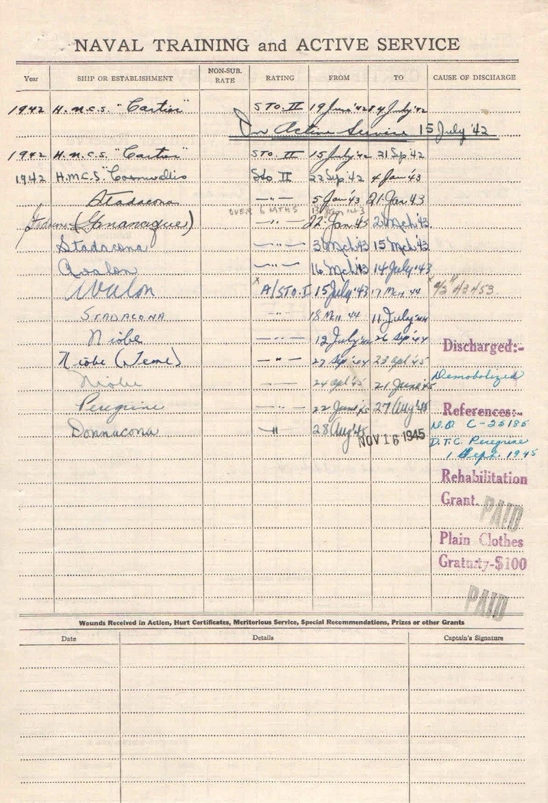 Ships served in: HMCS GANANOQUE - Served in Gananoque 22 Jan 1943 - 02 Mar 1943 as a Sto 2c, RCNVR HMCS TEME - Served in Teme 27 Apr 1944 - 23 Apr 1945 as a A/Sto 1c, RCNVR