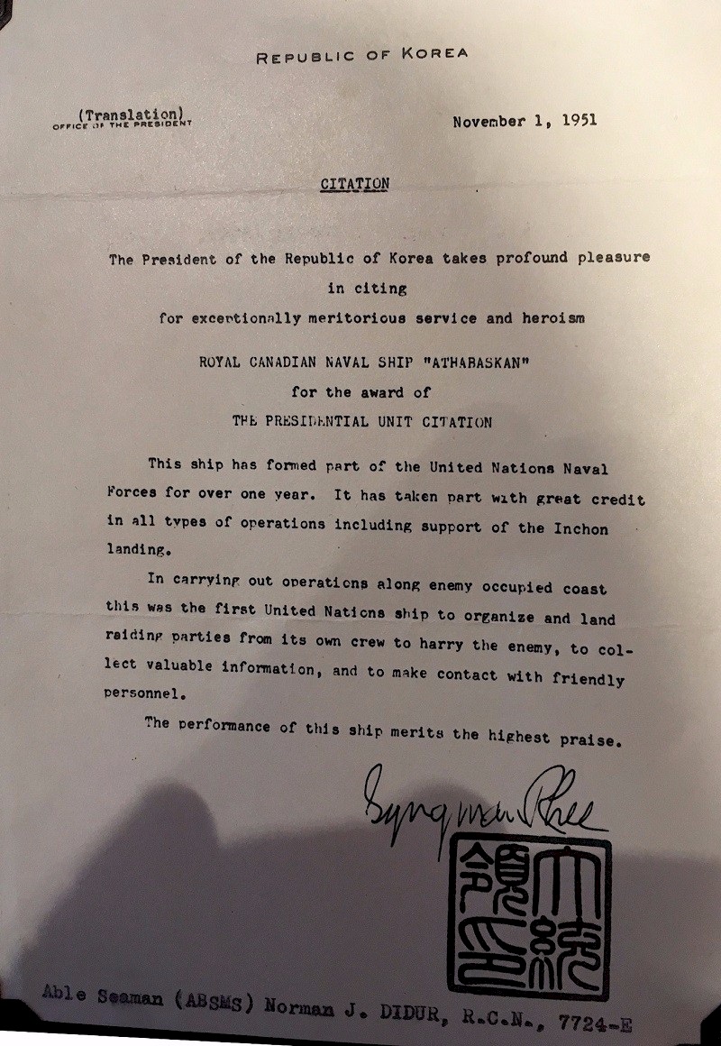 Ships served in: (1) Norman Didur at HMCS Cornwallis (2) Republic of Korean, Presidential Unit Citation to HMCS Athabaskan