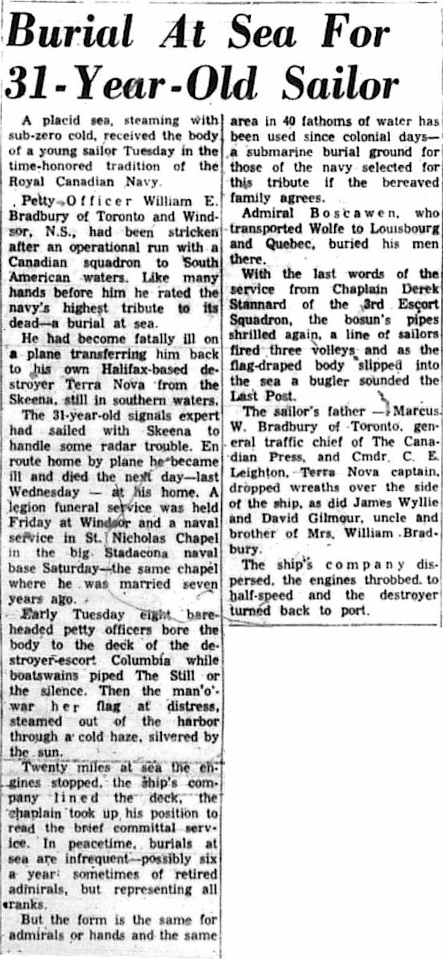 Ships served in: HMCS SKEENA - TD to SKEENA Jan/Feb 1966 to fix a radar problem Newspaper article on the death of PO Bradbury Halifax Chronicle-Herald, Wed 23 Feb 1966