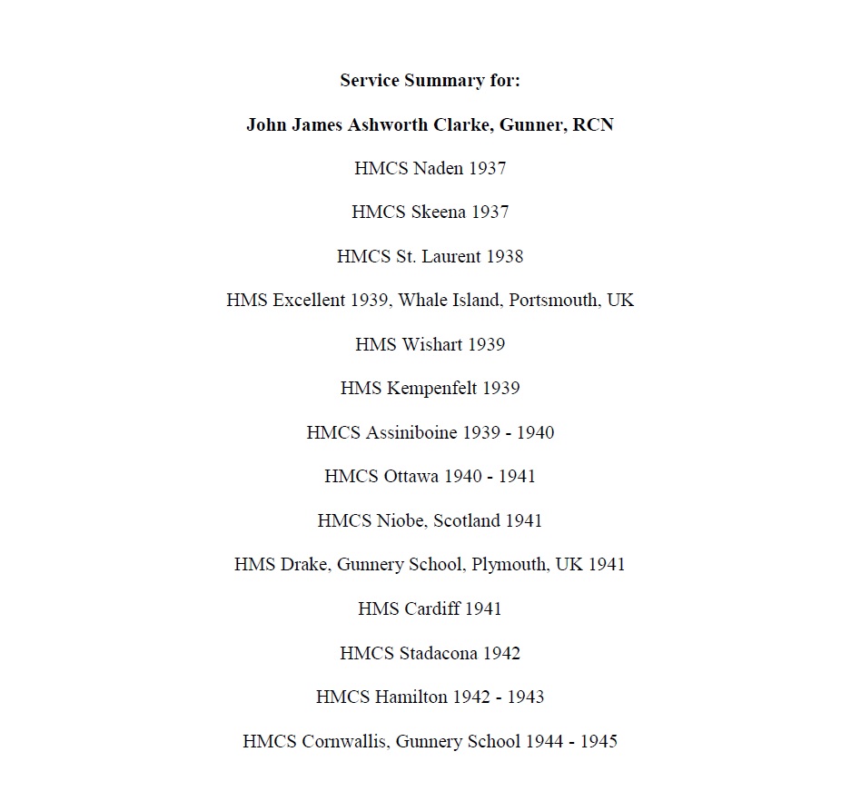 Ships served in: HMCS SKEENA - 1937 HMCS ST LAURENT - 1938 HMS WISHART - 1939 HMS KEMPENFELT / HMCS ASSINIBOINE - 1939-1940 HMCS OTTAWA - Served in Ottawa 1940-1941 as an AB, Gunner, RCN HMS CARDIFF - 1941 HMCS HAMILTON 1942-1943