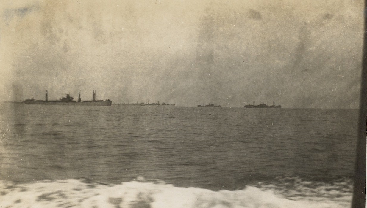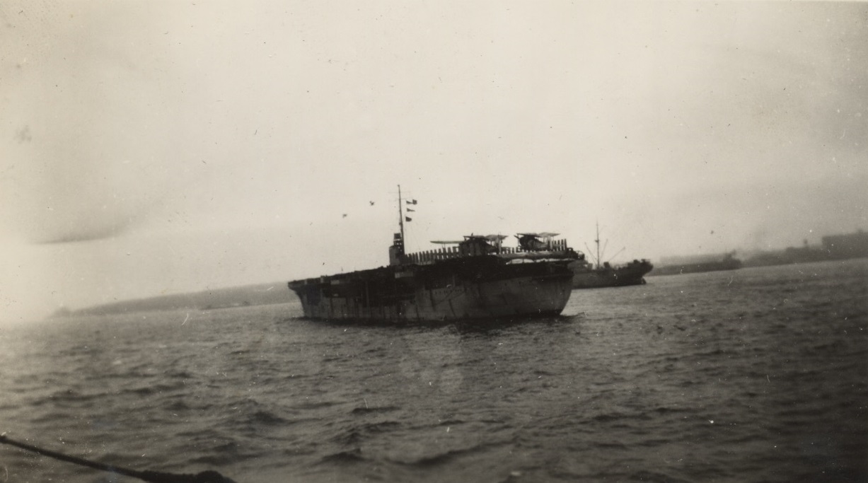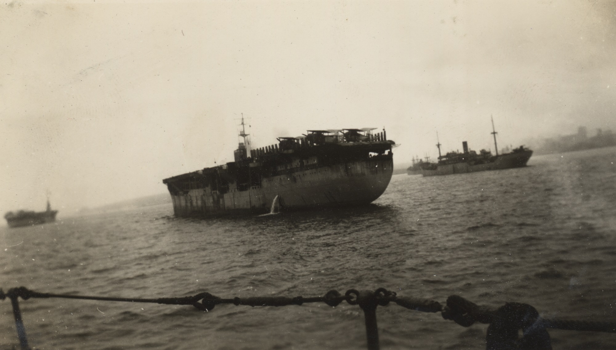 (9) Atlantic Convoy (10-11) Convoy ships at anchor. Merchant Aircraft Carrier (MAC) centre of photo (12) Merchant Aircraft Carrier (13) Merchant Aircraft Carrier (this was two photos taped together to get the full ship) (14) Unknown cruise liner (15) Unknown sailor (16) Maurice (Whitey) Hampson out on the yardarm - possibly on Trois Rivieres