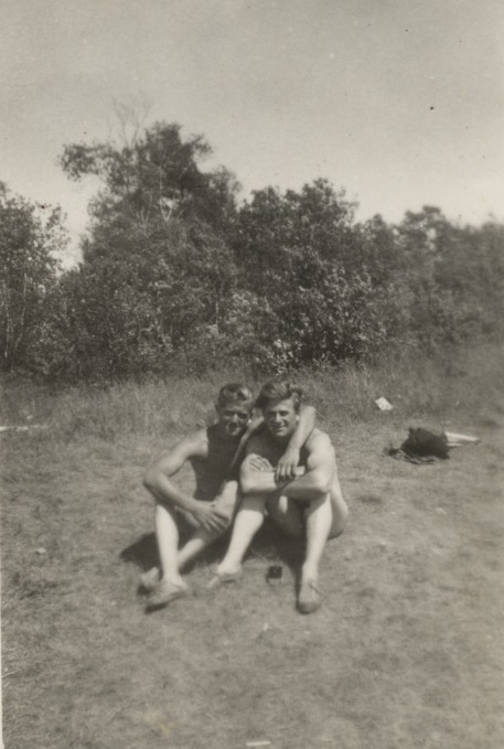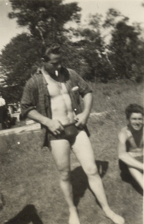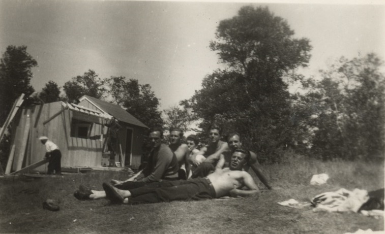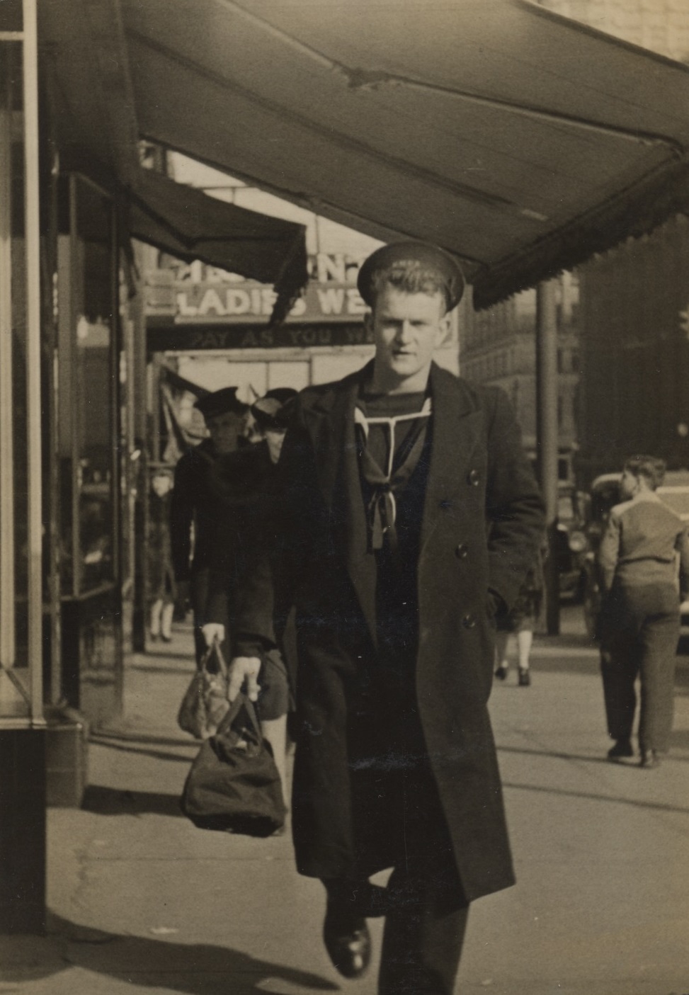 (25) Unknown group of people "hard at work" building what appears to be a cottage (26) William Connor (left), other person unknown (27) Unknown person (28) Unknown sailor (29) Unknown ship - heavily damaged - "I remember my grandpa telling me about a ship that was heavily damaged in a collision and had to be towed to dry dock in Halifax for repair... can't remember at the moment any more details than that." (30) Unknown sailor (31) William Connor, Granville Street, Vancouver, Feb 1944