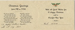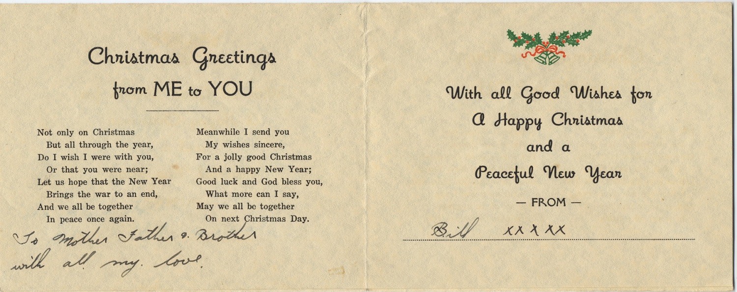 (1-3) Christmas card from William Connor to his parents - year unknown (4) Card given to lookouts (5) William Connor and shipmates. William 2nd from left (6) A Welcome Home card that was attached to a parcel will received when he returned home after his discharge (7) William Connor - date unknown (8) Telegram from William to his parents telling them he will be home