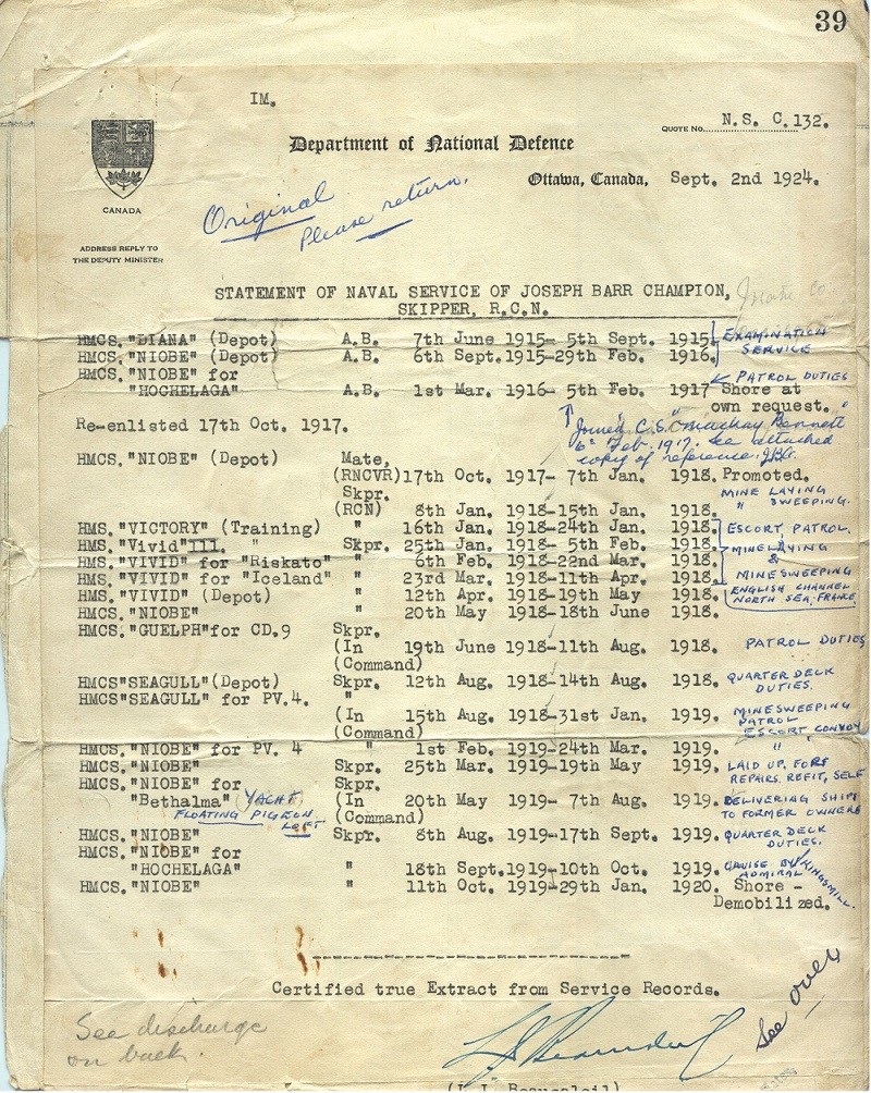 Ships served in: HMCS HOCHELAGA - Served in Hochelaga 01 Mar 1916 - 05 May 1917 as an AB, RNCVR // 18 Sep 1919 - 10 Oct 1919 as Skpr, RCN. Joseph notes that his 2nd time on Hochelaga was for a cruise by Admiral Kingsmill HMT RISKATO - Served in Riskato as a Skipper, RCN 06 Feb 1918 - 22 Mar 1918. Note: Riskato was a hired trawler. Built in 1916. Armament: 1-6pdr AA. In service May 1916 - 1919 as minesweeper. Served also served in WW2. HMT ICELAND - Served in Iceland 23 Mar 1918 - 11 Apr 1918 as a Skipper, RCN. Note: Iceland, was a hired trawler. Built 1916, Armament: 1-6pdr AA. In service Oct 1916 - Dec 1918 as minesweeper, then escort vessel. Became Icelandic "Egill Skallagrimsson" in 1919. CD 9 - Served in CD-9, Jun 1918 - 11 Aug 1918 as Skpr, RCN, Commanding Officer PV IV - Served in PV IV, 15 Aug 1918 - 24 Mar 1919 as Skpr, RCN, Commanding Officer HMCS BETHALMA - Served in Bethalma 20 May 1919 - 07 Aug 1919 as Skpr, RCN, Commanding Officer. Joseph described Bethalman as a Floating Pigeon Loft.