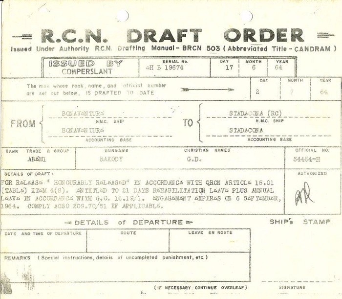 HMCS BONAVENTURE - Served in BONAVENTURE in 1962-1964 as an AB.EM1, RCN