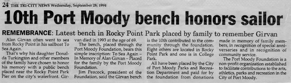 Newspaper article on waterfront bench at Port Moody placed in honour of Alan Girvan