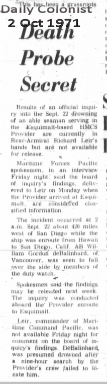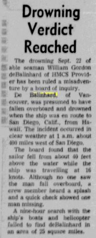 AB deBalinhard was presumed drowned after falling overboard off HMCS PROVIDER while enroute from Hawaii to San Diego. The search was called off after 9 hours. His body was not recovered.