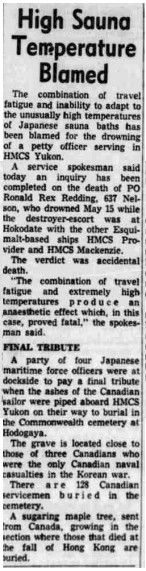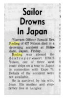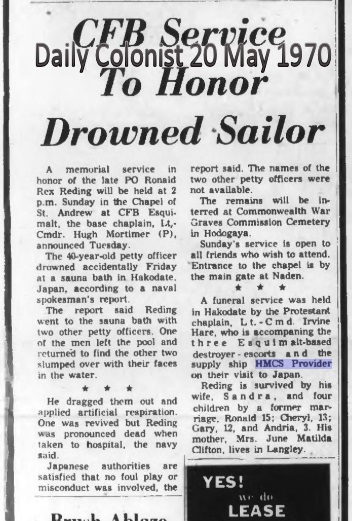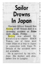 (RR01) Photo of PO Ronald Reding // Source: Ancestry post by Lisa Reding (RR02) Grave marker for PO Ronald Reding (RR03) PO Reding drowns in Japan // The Times Colonist 16 May 1970 // Researched by Steve Hutchings (RR04) Memorial service for PO Reding // The Daily Colonist 20 May 1970 // Researched by Steve Hutchings (RR05) PO Redings death blamed on fatigue and the high temperature of Japanese sauna baths // The Times Colonist 02 Jun 1970 // Researched by Steve Hutchings