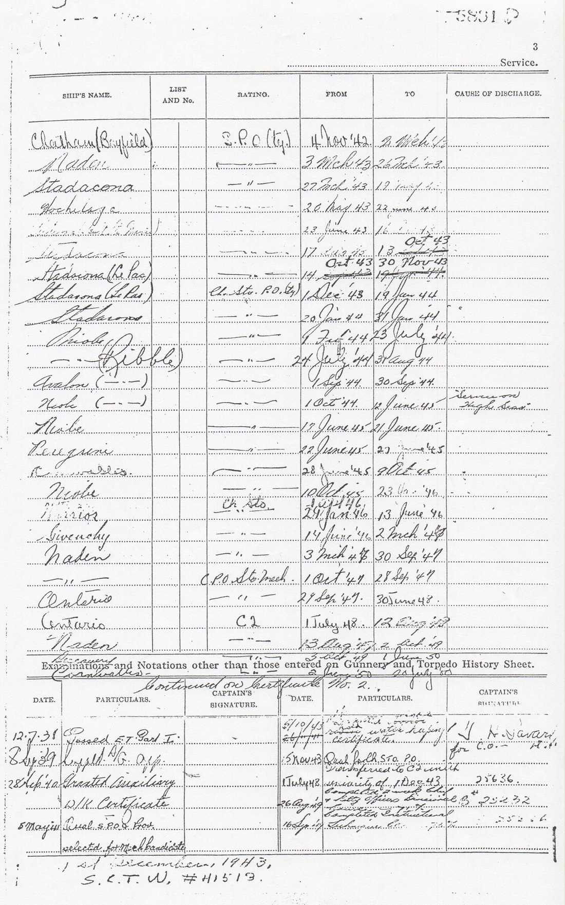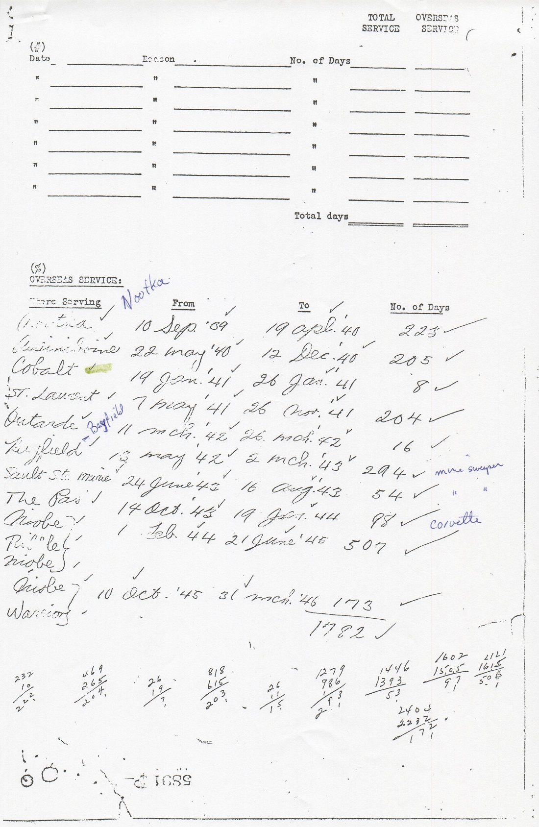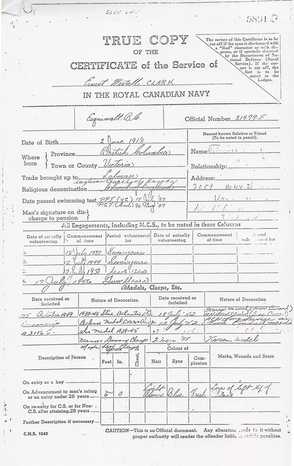 Ships served in: HMCS NOOTKA - Served in Nootka 10 Sep 1939 - 19 Apr 1940 HMCS ASSINIBOINE - Served in Assiniboine 22 May 1940 - 12 Dec 1940 HMCS COBALT - Served in Cobalt 19 Jan 1941 - 26 Jan 1941 HMCS ST LAURENT - Served in St Laurent 07 May 1941 - 26 Nov 1941 HMCS OUTARDE - Served in Outarde 11 Mar 1942 - 26 Mar 1942 HMCS BAYFIELD - Served in Bayfield 13 May 1942 - 02 Mar 1943 as a Sto PO, RCN. Appointed Sto PO 04 Nov 1942. HMCS SAULT STE MARIE - Served in Sault Ste Marie 23 Jun 1943 - 16 Aug 1943 as a Sto PO, RCN HMCS THE PAS - Served in The Pas 14 Oct 1943 - 19 Jan 1944 as a Sto PO and Ch Sto PO, RCN. Rated Ch Sto PO 01 Dec 1943 HMCS RIBBLE - Served in Ribble - 24 Jul 1944 - 12 Jun 1945 as a Ch Sto PO, RCN HMCS WARRIOR - Served in Warrior 24 Jan 1945 - 13 Jun 1946 as a Ch Sto PO and Ch Sto, RCN. Rated Ch Sto 01 Apr 1946 HMCS ONTARIO - Served in Ontario 29 Sep 1947 - 12 Aug 1949 as a CPO Sto Mech & C2SM. Rated C2SM 01 Jul 1948 HMCS DISCOVERY - Served in Discovery 03 Oct 1949 - 01 Jun 1950 and 21 Jul 1950 - 28 Feb 1951 as a C2SM, RCN HMCS CRUSADER - Served in Crusader 02 Apr 1951 - 26 Jul 1951 as C2SM, RCN HMCS SAULT STE MARIE - Serve in Sault Ste Marie 03 Aug 1951 - 18 May 1952 as a C2SM, RCN HMCS CRUSADER - Served in Crusader 19 May 1952 - 01 Sep 1953 as a C2SM, RCN - 1st Korean War tour. Rated C2EM3(NQ) 16 Jul 1953 HMCS NEW GLASGOW - Served in New Glasgow 03 May 1954 - 17 Jul 1955 as a C2EM3 & C1EM3, RCN. Rated CPO1 15 Apr 1954 HMCS DISCOVERY (Recruiting office) 18 Jul 1955 - 11 Jul 1958 as a C1EM3 / C1EMS. Rated C11EMS 01 Jan 1957. Honourably released 11 Jul 1958