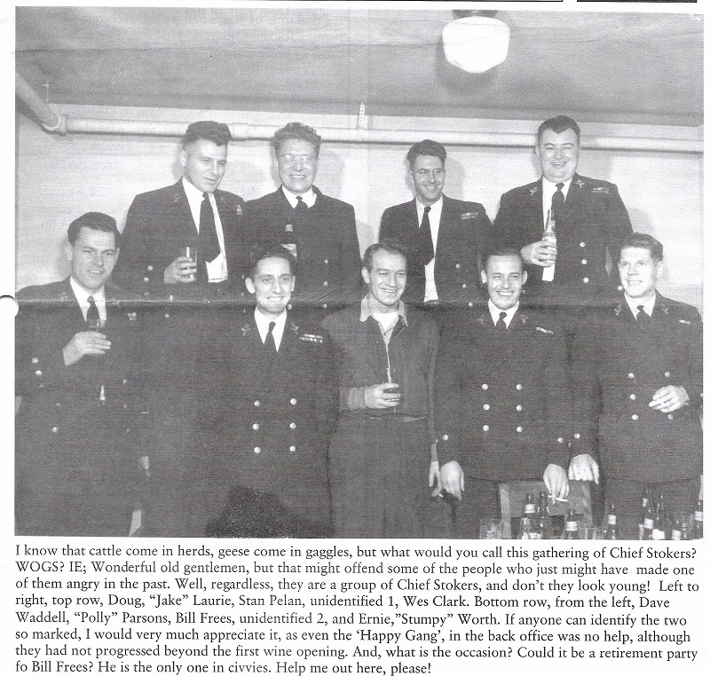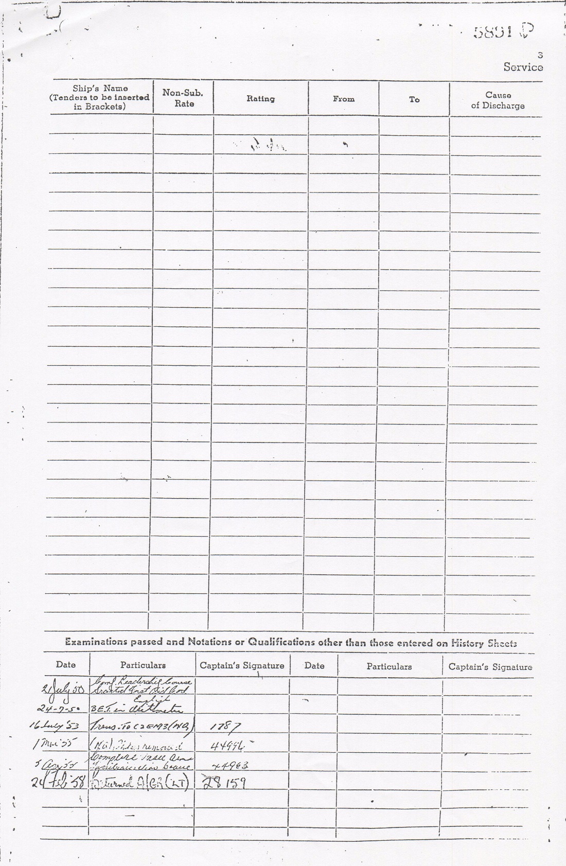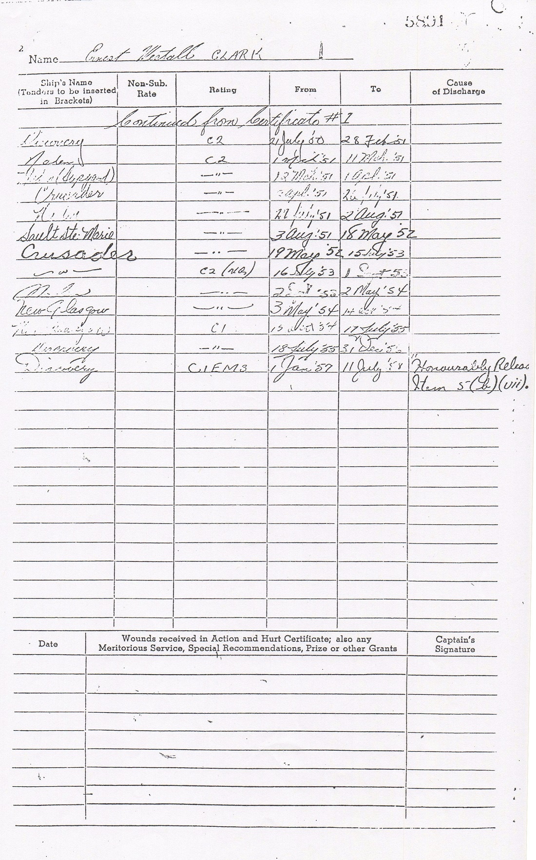 Ships served in: HMCS NOOTKA - Served in Nootka 10 Sep 1939 - 19 Apr 1940 HMCS ASSINIBOINE - Served in Assiniboine 22 May 1940 - 12 Dec 1940 HMCS COBALT - Served in Cobalt 19 Jan 1941 - 26 Jan 1941 HMCS ST LAURENT - Served in St Laurent 07 May 1941 - 26 Nov 1941 HMCS OUTARDE - Served in Outarde 11 Mar 1942 - 26 Mar 1942 HMCS BAYFIELD - Served in Bayfield 13 May 1942 - 02 Mar 1943 as a Sto PO, RCN. Appointed Sto PO 04 Nov 1942. HMCS SAULT STE MARIE - Served in Sault Ste Marie 23 Jun 1943 - 16 Aug 1943 as a Sto PO, RCN HMCS THE PAS - Served in The Pas 14 Oct 1943 - 19 Jan 1944 as a Sto PO and Ch Sto PO, RCN. Rated Ch Sto PO 01 Dec 1943 HMCS RIBBLE - Served in Ribble - 24 Jul 1944 - 12 Jun 1945 as a Ch Sto PO, RCN HMCS WARRIOR - Served in Warrior 24 Jan 1945 - 13 Jun 1946 as a Ch Sto PO and Ch Sto, RCN. Rated Ch Sto 01 Apr 1946 HMCS ONTARIO - Served in Ontario 29 Sep 1947 - 12 Aug 1949 as a CPO Sto Mech & C2SM. Rated C2SM 01 Jul 1948 HMCS DISCOVERY - Served in Discovery 03 Oct 1949 - 01 Jun 1950 and 21 Jul 1950 - 28 Feb 1951 as a C2SM, RCN HMCS CRUSADER - Served in Crusader 02 Apr 1951 - 26 Jul 1951 as C2SM, RCN HMCS SAULT STE MARIE - Serve in Sault Ste Marie 03 Aug 1951 - 18 May 1952 as a C2SM, RCN HMCS CRUSADER - Served in Crusader 19 May 1952 - 01 Sep 1953 as a C2SM, RCN - 1st Korean War tour. Rated C2EM3(NQ) 16 Jul 1953 HMCS NEW GLASGOW - Served in New Glasgow 03 May 1954 - 17 Jul 1955 as a C2EM3 & C1EM3, RCN. Rated CPO1 15 Apr 1954 HMCS DISCOVERY (Recruiting office) 18 Jul 1955 - 11 Jul 1958 as a C1EM3 / C1EMS. Rated C11EMS 01 Jan 1957. Honourably released 11 Jul 1958