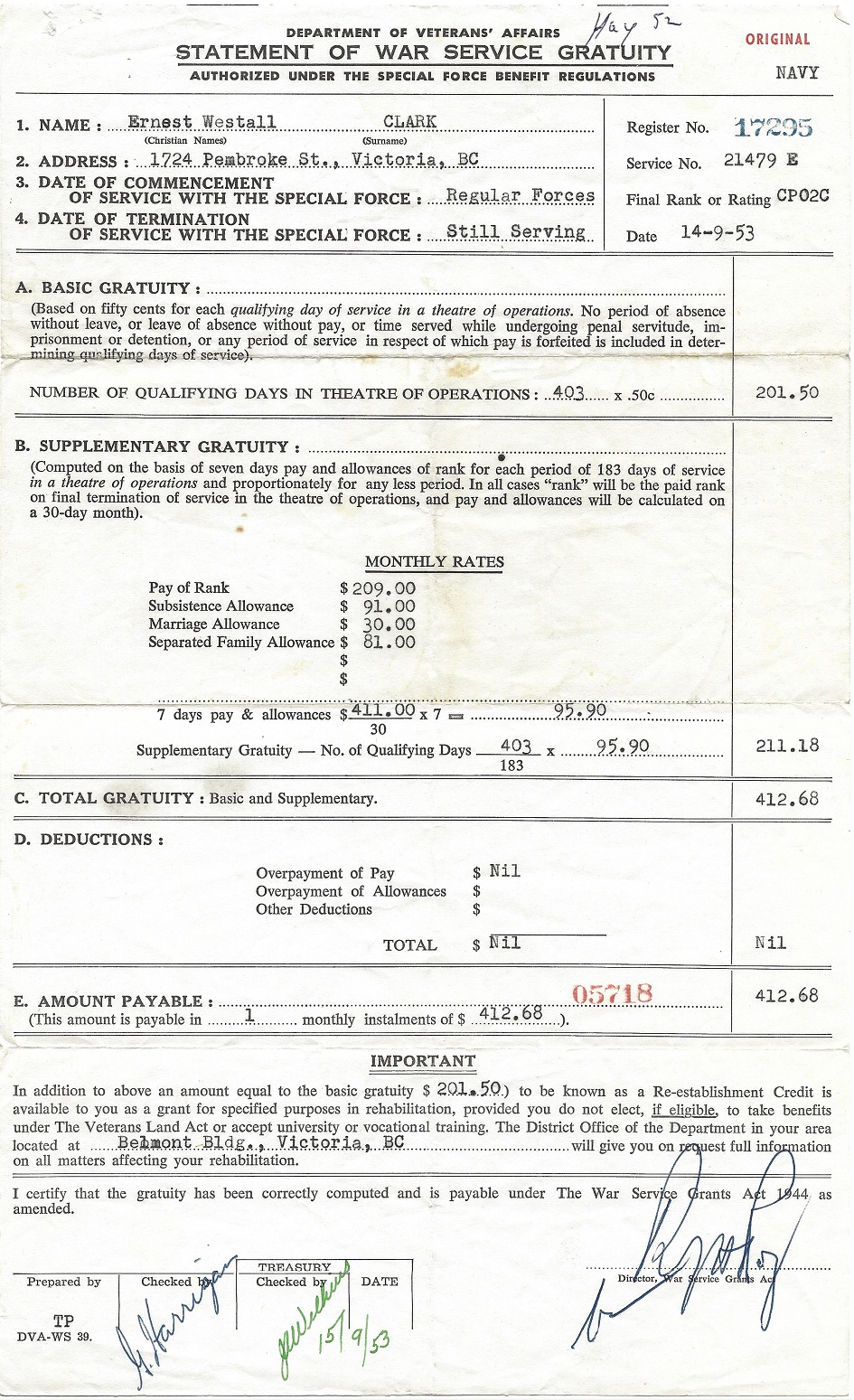 (WC14) Ernest Clark's War Service Gratuity for the Korean War
