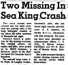 (1) Two Missing in Sea King Crash - Halifax Mail-Star, Friday, 01 Dec 1967 (2) Still Missing - Halifax Mail-Star, Saturday, 02 Dec 1967 (3) Call Of Sea Search For Missing Naval Airmen - Halifax Mail-Star, Saturday 02 Dec 1967 (4) Commissioned Officer Tully and PO1 Mander remembered 50 years later (Trident newspaper article)