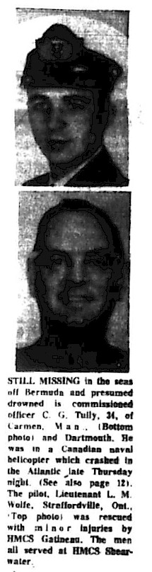 A memorial service for Claire Gordon Tully, 36, of Dartmouth, lost when the Sea King helicopter in which he was flying crashed into the sea off Bermuda, Nov. 30, will be held Saturday at 2:30 p.m. in St. Michael's Chapel, HMCS Shearwater. Born in Culrose, Man., the son of Mrs. Hattie Tully and the late Frederick Tully, he is survived by, besides his mother; wife, the former Chardell Elizabeth Richardson; three sons, Randolph, Richard and Kenneth; and one sister, Glenda Tully, Winnipeg. (Halifax Chronicle-Herald 07 Dec 1967)