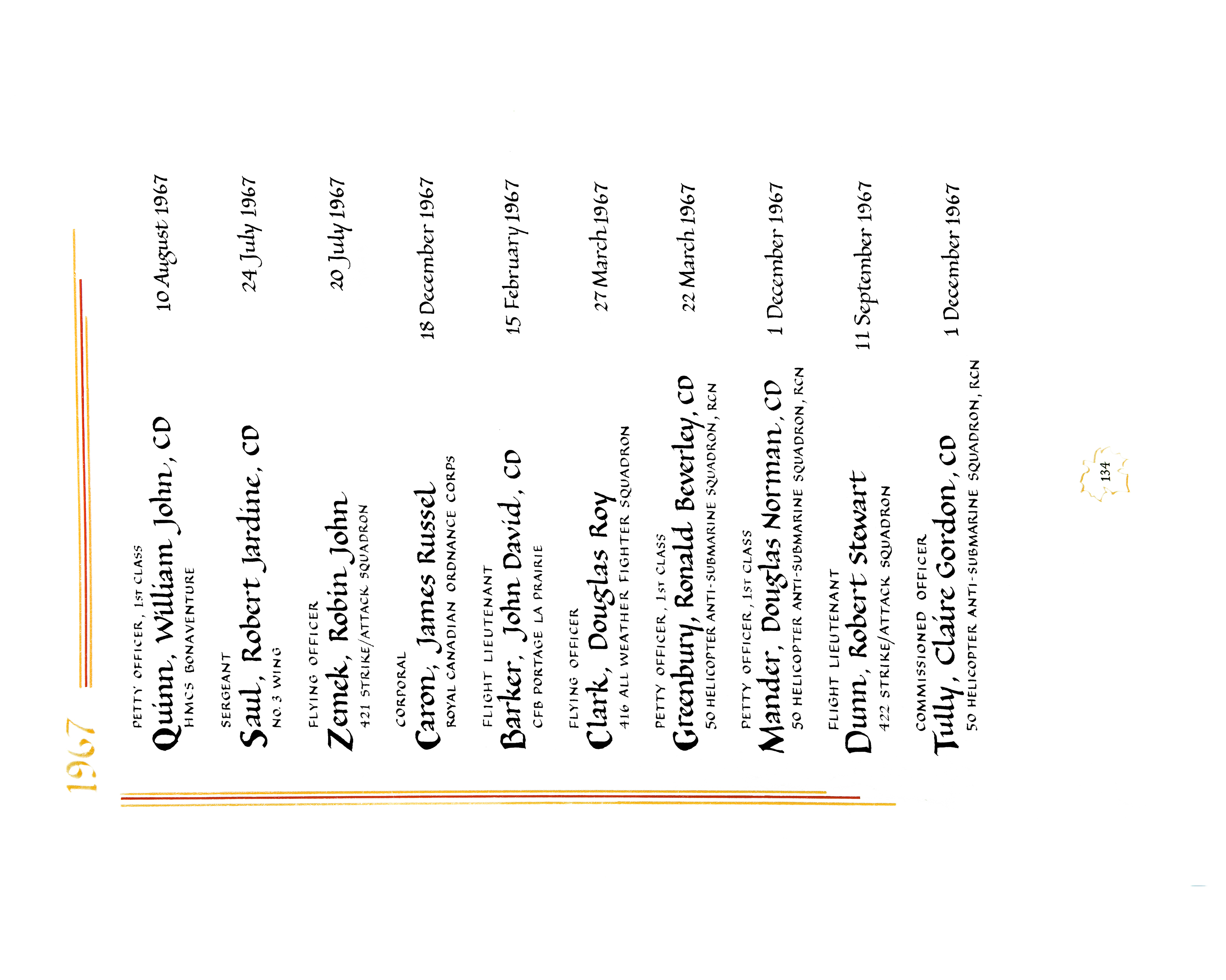 TULLY, Claire Gordon, CD, Commissioned Officer, RCN, died 01 Dec 1967, 50 Helicopter Anti-Submarine Squadron / HMCS BONAVENTURE - Son of Frederick and Hattie of Elm Creek, MB; husband of Chardell Tully; father of Randolph, Richard, Kenneth Tully; brother of Glenda.