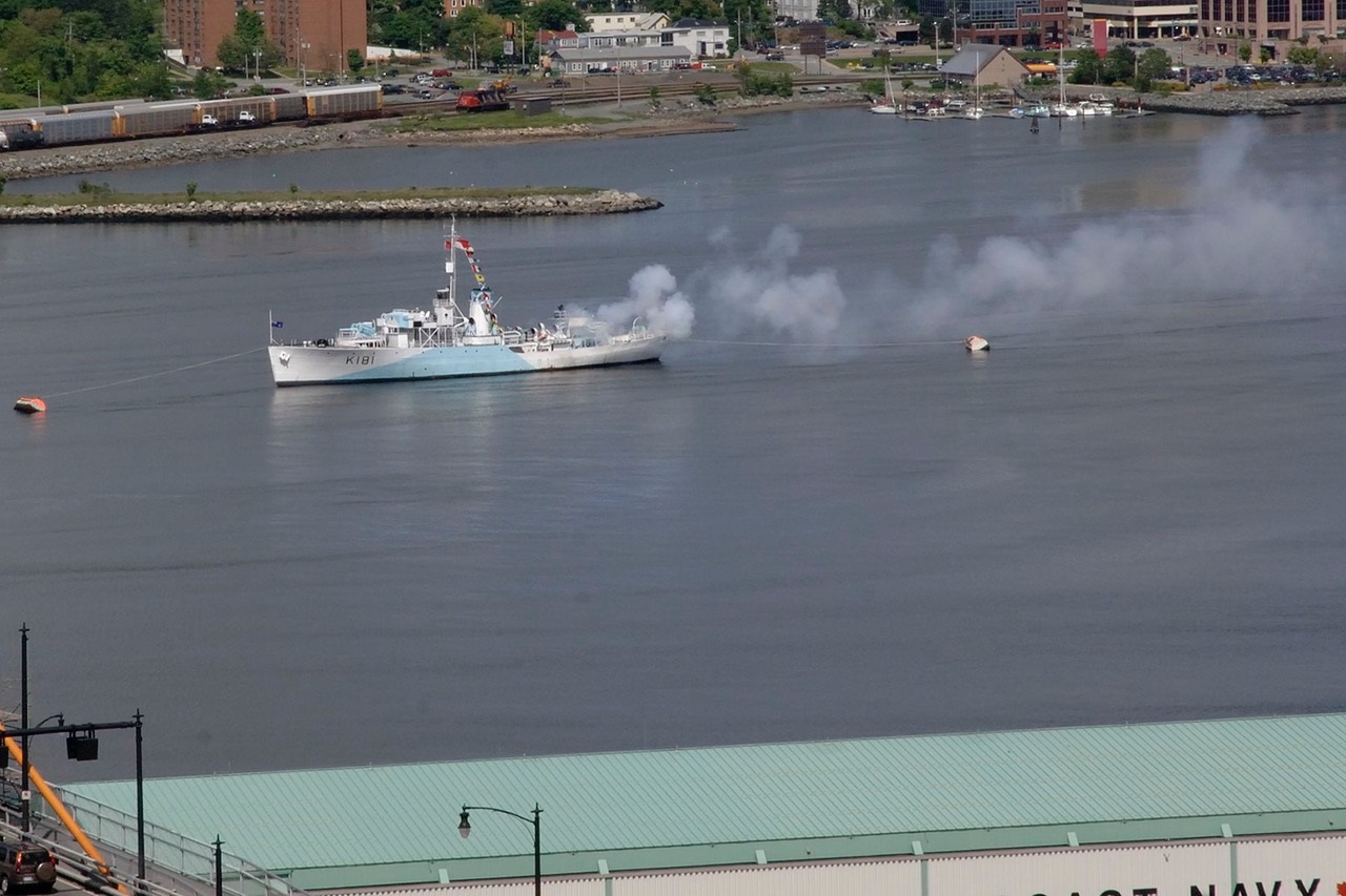 HMCS SACKVILLE fires a 13-gun salute during the memorial service for RAdm Robert Timbrell, C.M.M., D.S.C., M.I.D., C.D. - 12 Jun 2006