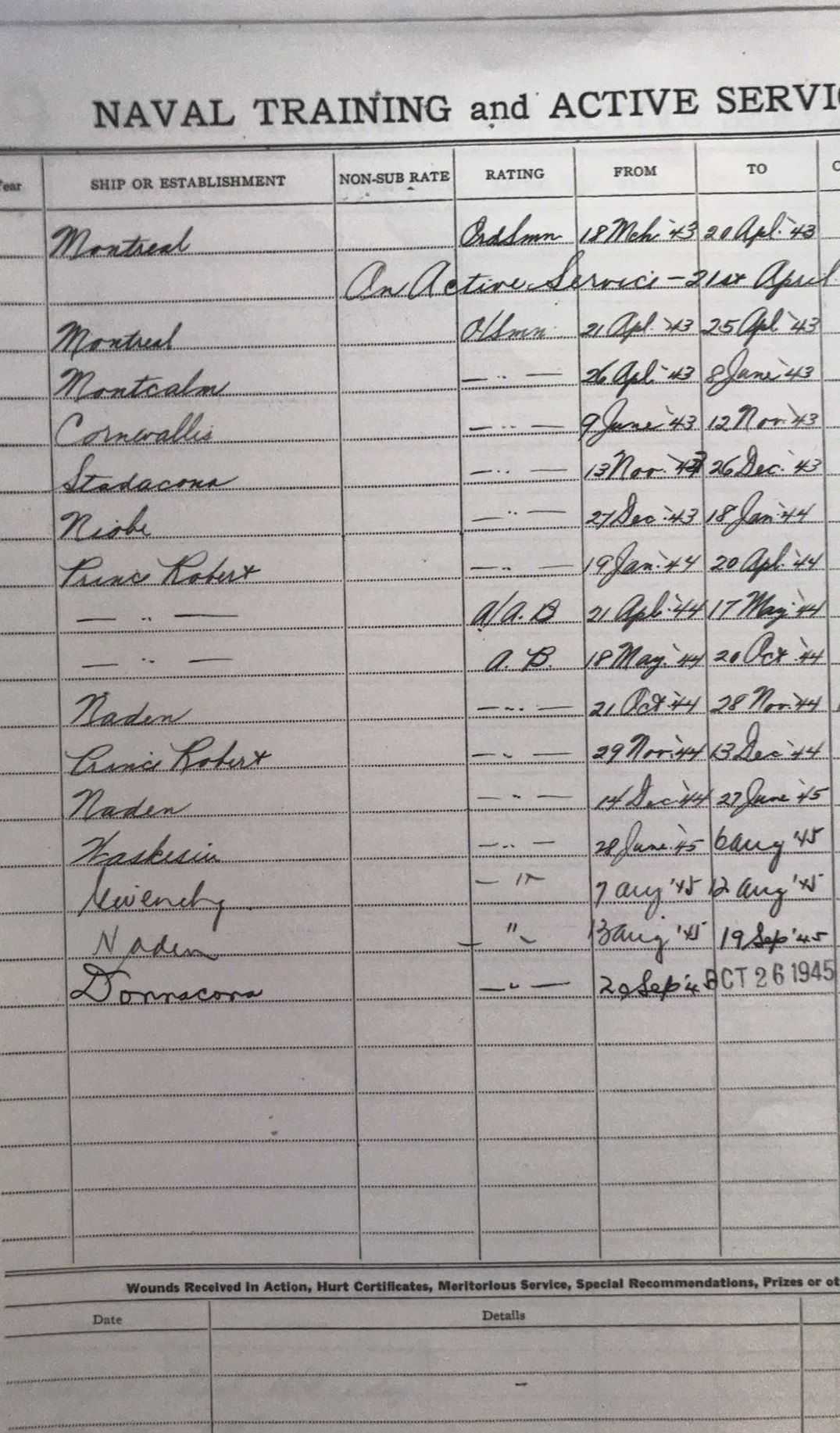 Ships served in: RCNVR DIVISION MONTREAL - Enlisted 18 Mar 1943. Commenced active service 21 Apr 1943 HMCS MONTCALM - 26 Apr 1943 - 08 Jun 1943 as an OS, RCNVR HMCS PRINCE ROBERT - served in Prince Robert 14 Jan 1944 - 20 Oct 1944 as an OS / AB, RCNVR and, 29 Nov 1944 - 13 Dec 1944 as an AB, RCNVR. Rated AB 18 May 1944 HMCS WASKESIU - Served in Waskesiu 28 Jun 1945 - 06 Aug 1945 HMCS DONNACONA - 20 Sep 1945 - 26 Oct 1945. Demobilized 26 Oct 1945