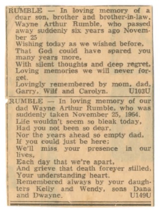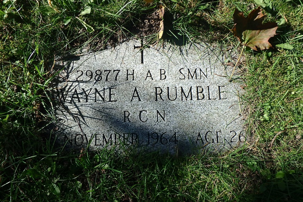 (1) AB.AR Rumble at HMCS Shearwater (2) Wayne at HMCS Shearwater - 1958 (3) Ron Dixon (best man) and Wayne (right) - 1959 (4) Wayne in Bermuda - 1960 (5) Memoriam for Wayne published 6 years after his passing (6) Wayne's headstone at the Mount Hope Cemetery, Brantford, ON