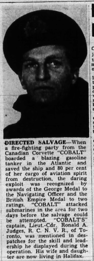 Ships served in: HMCS COBALT - Appointed to Cobalt 04 Mar 1943 as Mate, RCNR (Navy List Aug 1943). Awarded GM (Navy List Feb 1944). Appointed Lt, RCNR (seniority 07 Dec 1943) (Navy List May 1944). Appointed CO 31 Mar 1944 as Lt, RCNR (Navy List May 1944). 7th Commanding Officer (31 Mar 1944 - 25 Jun1944). Remained on Cobalt as Lt, RCNR till appointed to HMCS Hallowell. HMCS HALLOWELL - Appointed to Hallowell 26 Jul 1944 as Lt, RCNR. Commissioning crew 08 Aug 1944 (Navy List Sep 1944) HMCS SCOTIAN (Assistant King's Harbour Master) - Appointed to Scotian 27 Oct 1944 as Lt, RCNR * Note: Medically released 05 May 1945 Article on awards bestowed on 4 Cobalt crew members. Only the CO, LCdr Ronald Judges, RCNVR - awarded Mentioned in Despatches - is mentioned in the article by name. The other 3 sailors were Mate Alfred W. Bett, RCNR - awarded the George Medal; ERA 4c James Werely, RCNR- awarded the British Empire Medal; and, Sig Michael J. Fitzgerald, RCNVR - awarded the British Empire Medal Halifax newspaper 22 Mar 1944 Article research by / Courtesy of George Newbury