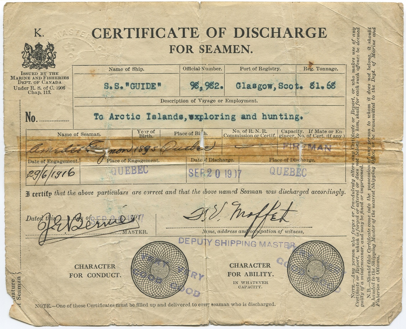 In 1916-1917, Amédée served as a stoker on S.S. Guide for Captain Joseph Bernier, in one of his private Arctic expeditions and wintered on Baffin Island.