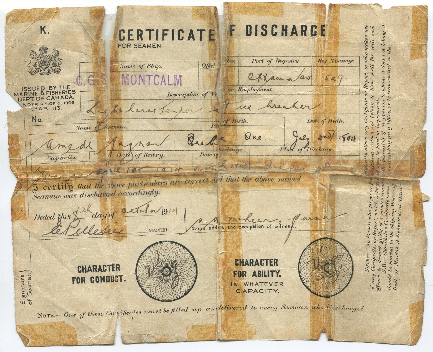 (AMD001) Certificate of Discharge from the C.G.S. Montcalm - 08 Oct 1914 (AMD002) Certificate of Discharge from the C.G.S. Montcalm - 06 Mar 1916 (AMD003) Certificate of Discharge from the S.S. Guide - 20 Sep 1917