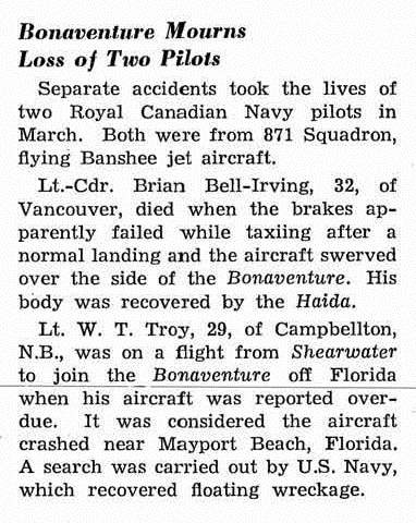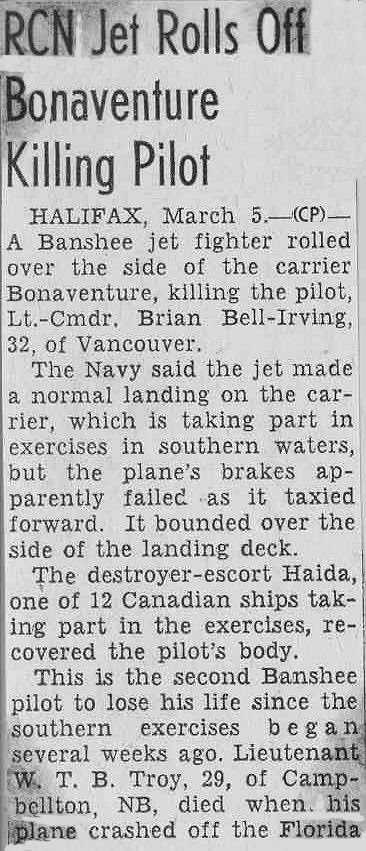 BELL-IRVING, Brian, LCdr (P), O-5756, RCN, died - 04 Mar 1958, 871 Squadron / HMCS BONAVENTURE - Son of Robert and Kathleen Rose Bell-Irving. Husband of Carolyn (nee Chelew) Bell-Irving and father of Michael Bell-Irving of Boulderwood, Nova Scotia. Brother of Peter, Robin and Harry Bell-Irving.