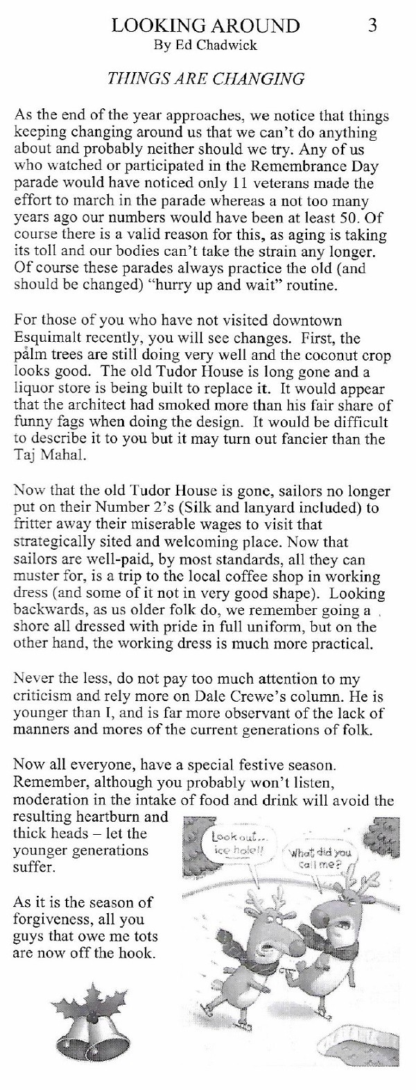 Ed served in the RCN and C.A.F. from 18 Apr 1947 to 28 Jul 1976 . He wrote regular bulletins for the C & PO's Association. Just prior to his passing, Ed wrote one final column. This was Ed's final column for the Chiefs and Petty Officers Association newsletter