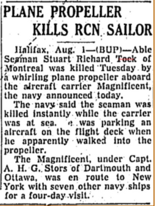 TOCK, Stuart Richard, AB, 19181-H, RCN, died 16 Aug 1955, HMCS MAGNIFICENT - son of John D. and Sarah (nee Gamble) Tock of Montreal, QC; husband of Maureen Tock and father of Richard W. and Colleen P. Tock of Montreal, QC; brother of Douglas J. Tock and Edna Sykes.