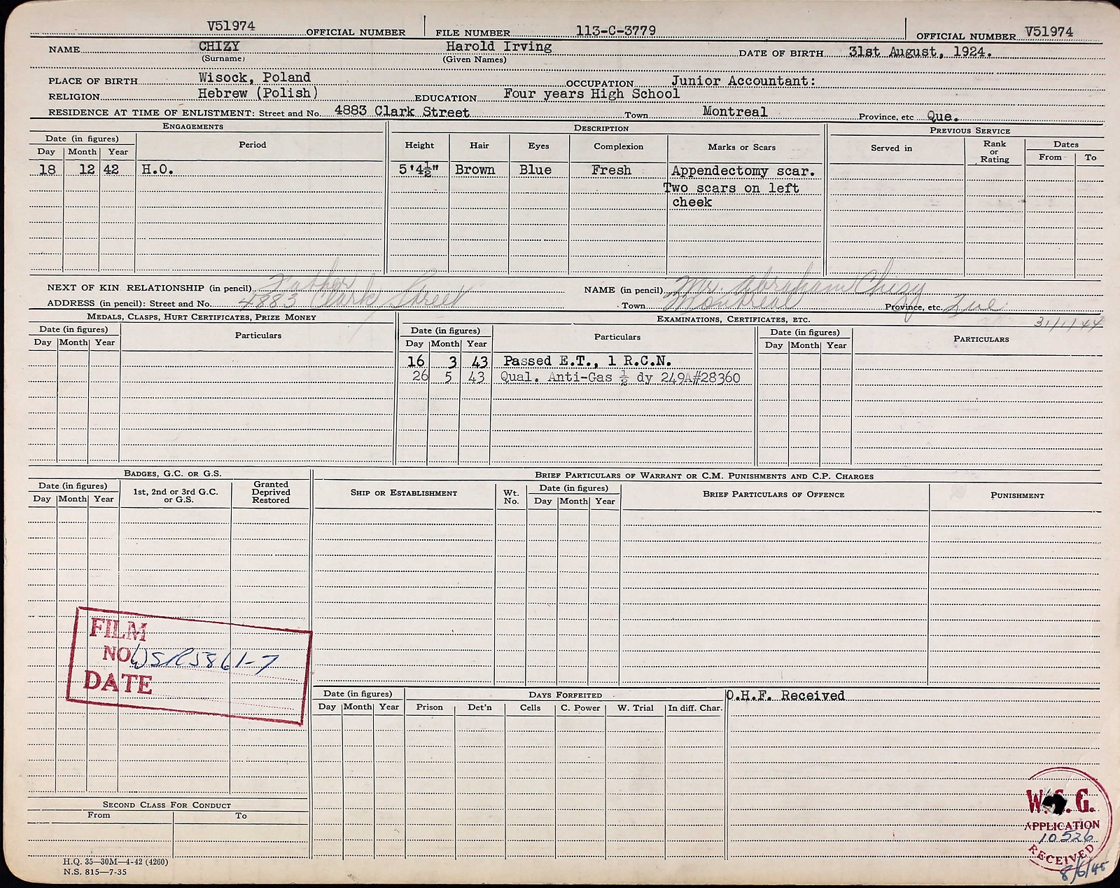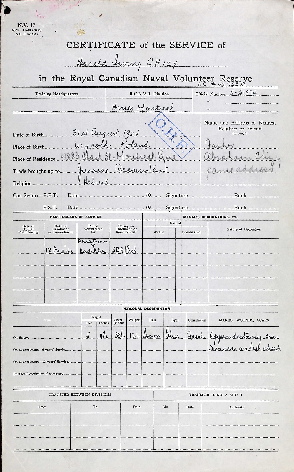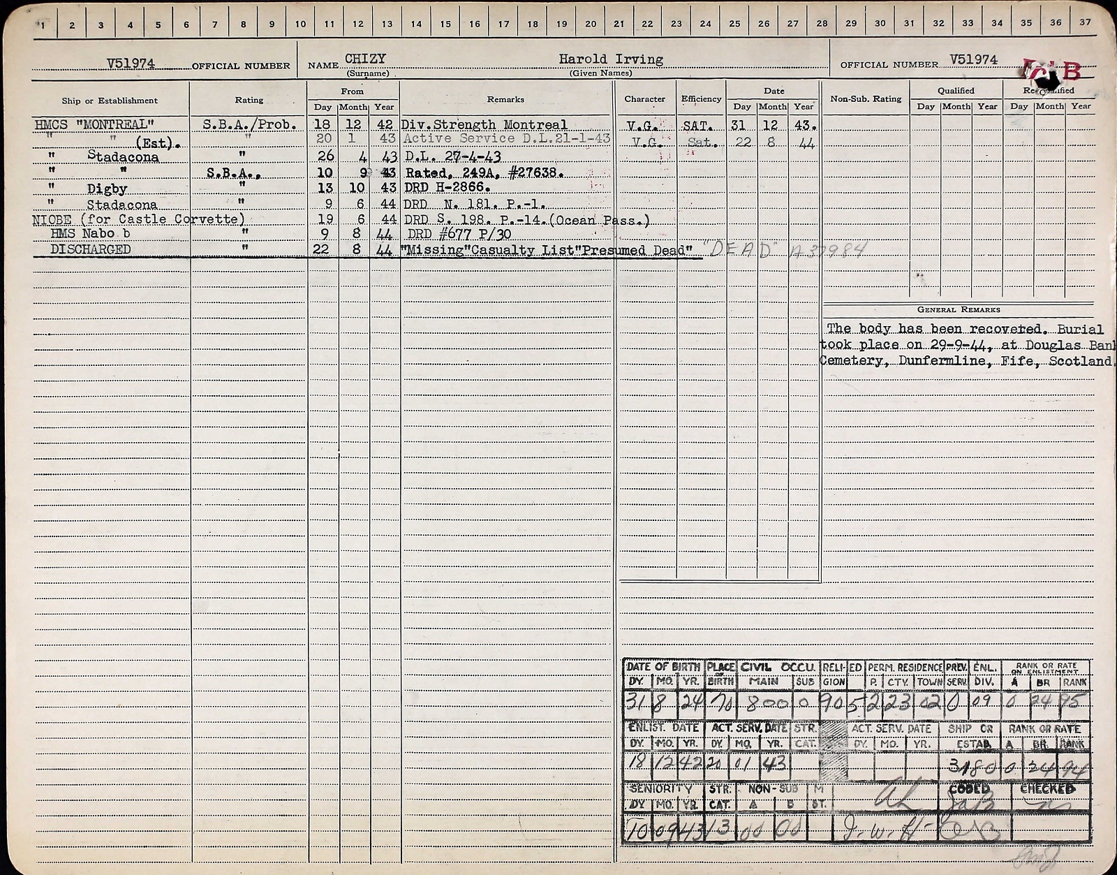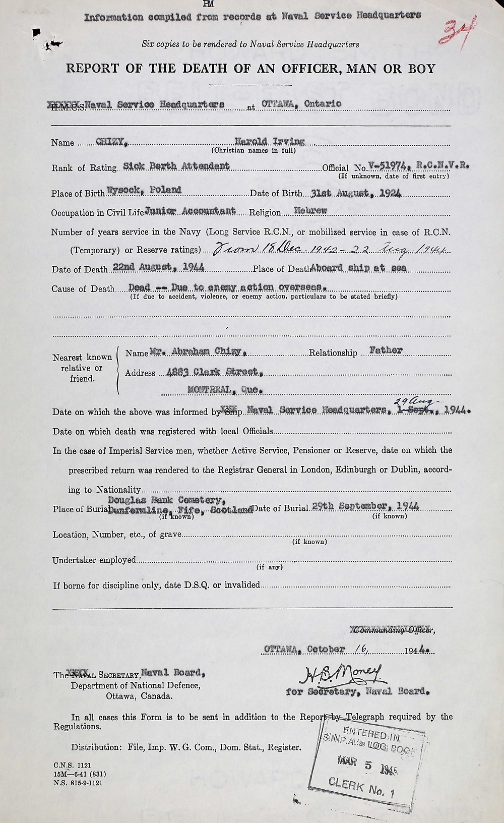 SBA Harold Irving Chizy, V51974, RCNVR, of Montreal, was killed in action on 22 Aug 1994, on board HMS Nabob, a Canadian-manned aircraft carrier which was torpedoed off North Cape, Norway. He was buried in Douglas Bank Cemetery, Dunfermline, Fife, Scotland, in the presence of Vice-Admiral P.W. Nelles, RCN. SBA Chizy was the son of Abraham Chizy of 4883 Clark St., Montreal. He was born in 1924 in Wysock, Poland, and was educated at Mount Royal Public School, Strathearn High School, Commercial High School and McGill University. He attended the Talmud Torah. He was a member of the Y.M.H.A., where a memorial trophy bearing his name is annually awarded to the most outstanding club in the Senior Division. He was an accountant before his enlistment. (extract from CANADIAN JEWS IN WORLD WAR II, Part II: Casualties, compiled by David Rome for the Canadian Jewish Congress, Montreal, 1948.)