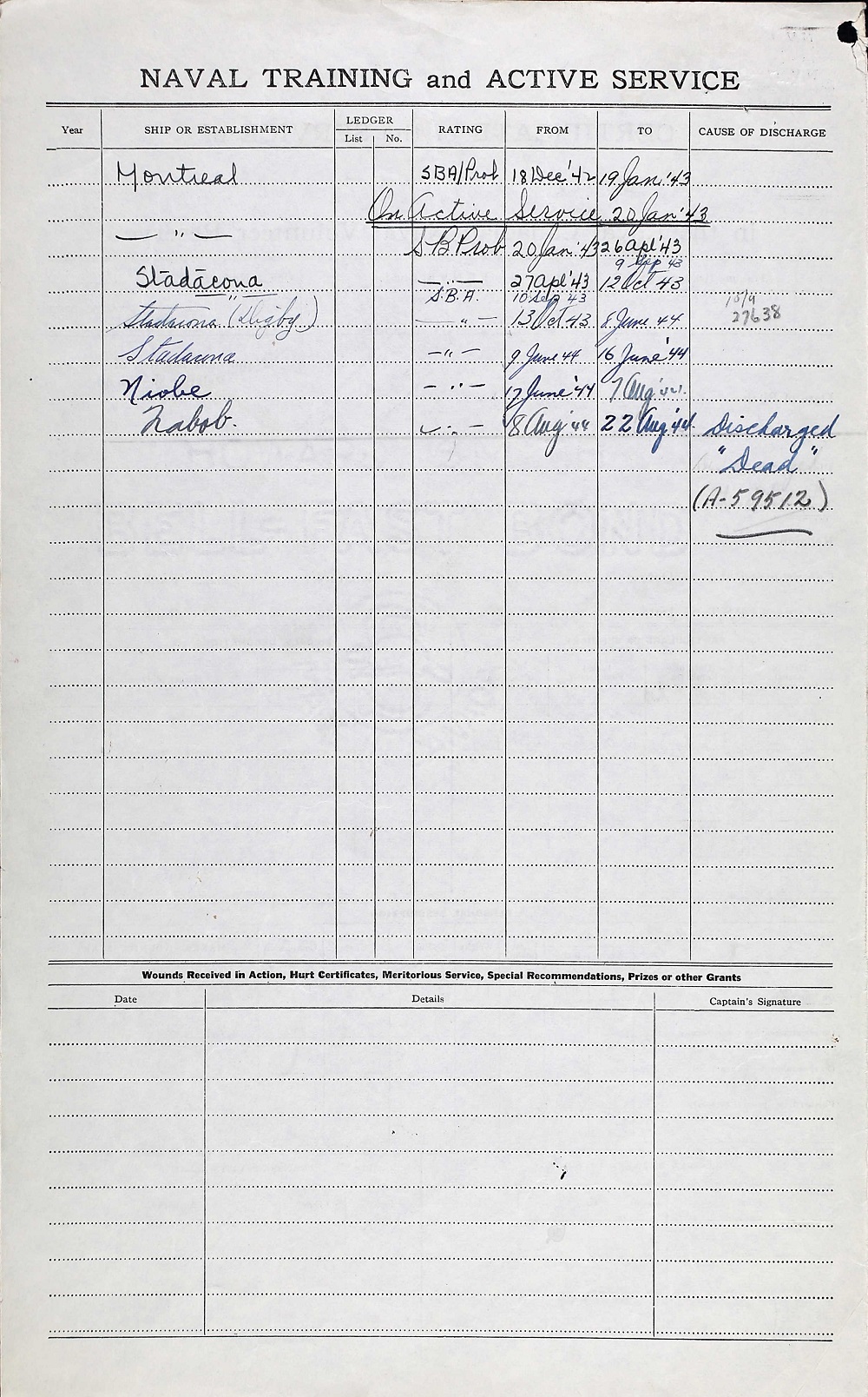 Ships served in: HMCS DIGBY - Served in Digby 13 Oct 1943 - 08 Jun 1944 as an SBA, RCNVR HMS NABOB - Drafted to Nabob 08 Aug 1944 as an SBA, RCNVR