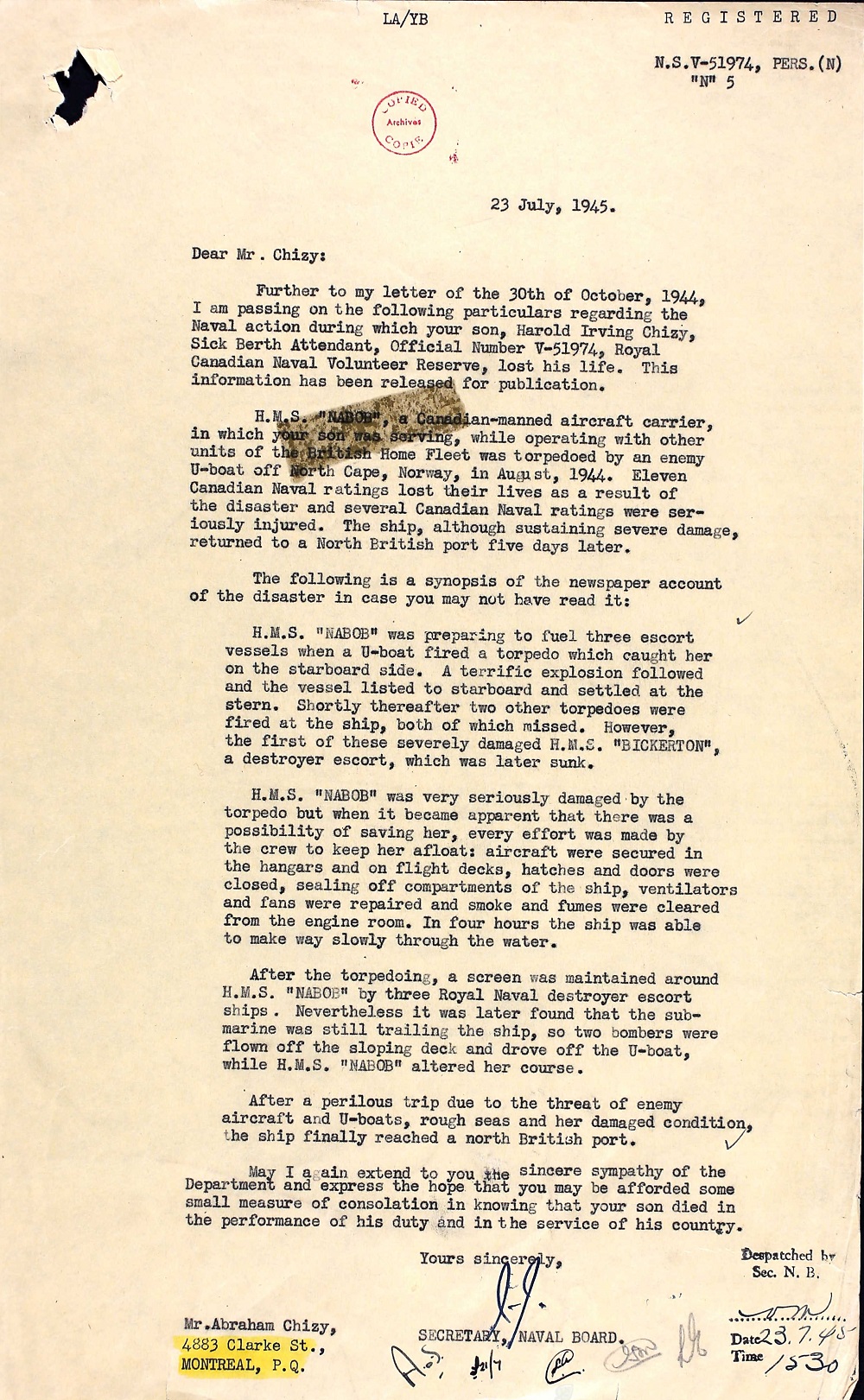 SBA Chizy died when his ship, HMS NABOB, was hit by a torpedo from U-354 which resulted in the loss of 21 of NABOB'S crew. NABOB made it back to port but was never repaired. She was later paid off and sold for scrap.