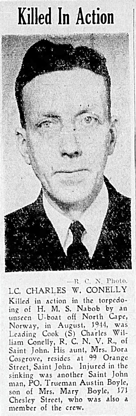 CONNOLLY, Charles William, L/Ck (S), V2601, RCNVR, killed- 22 Aug 1944, HMS NABOB - Son of Charles P. Connolly and Jenny Connolly, of Saint John, NB.