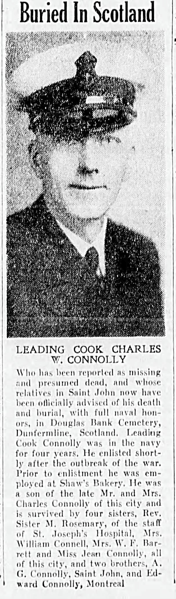 (CWC003) Leading Cook Charles Connolly Buried in Scotland  //  The Saint John Times Globe  //  Courtesy of Operation Picture Me