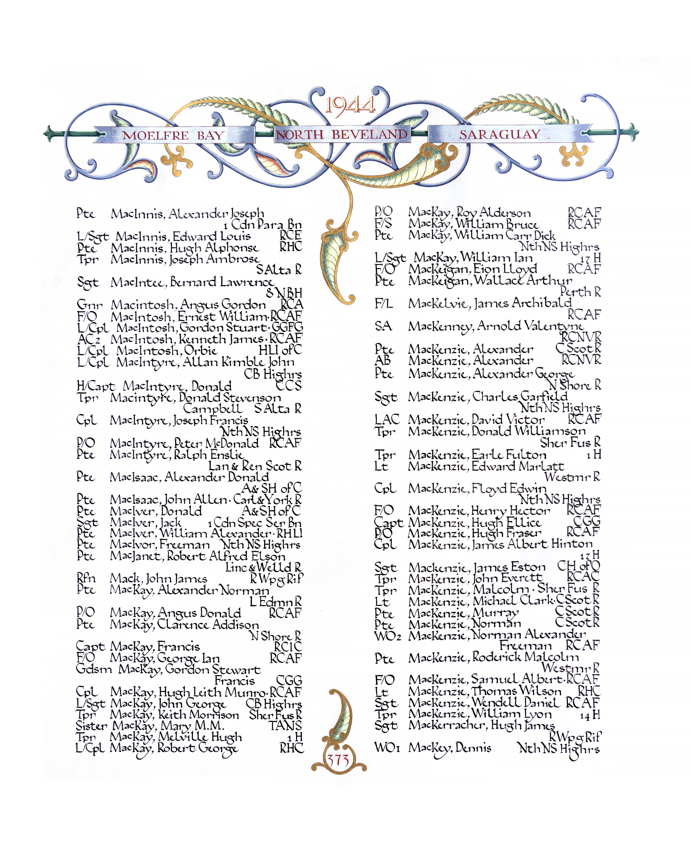 MacKENNEY, Arnold Valentyne, SA, V42713, RCNVR, killed - 22 Aug 2944, HMS NABOB - son of William A. and Mary MacKenney; husband of Jennie MacKenney; all of Vancouver, BC; brother of Leslie Floyd MacKenney of Halifax and George Laurence MacKenney of Vancouver.