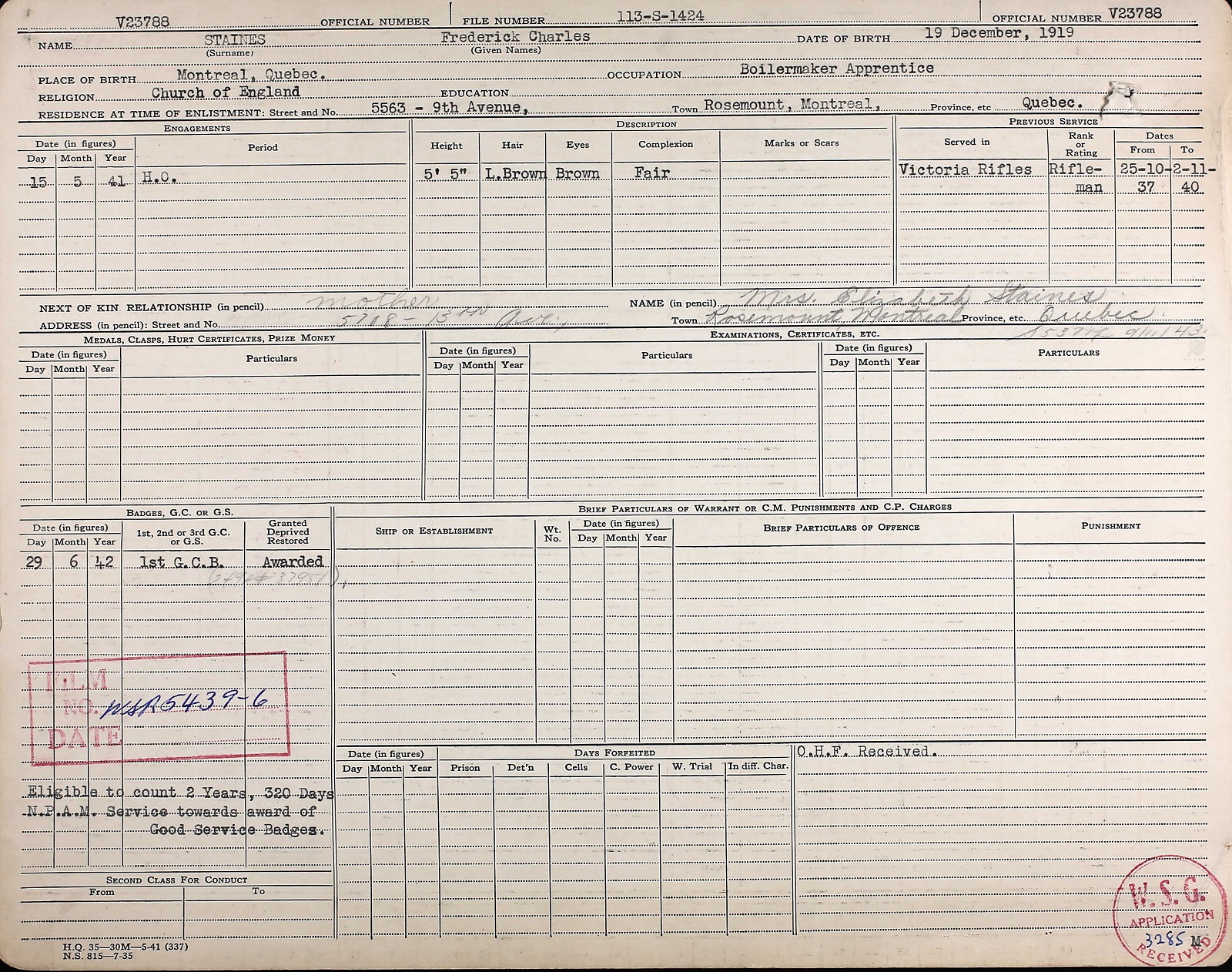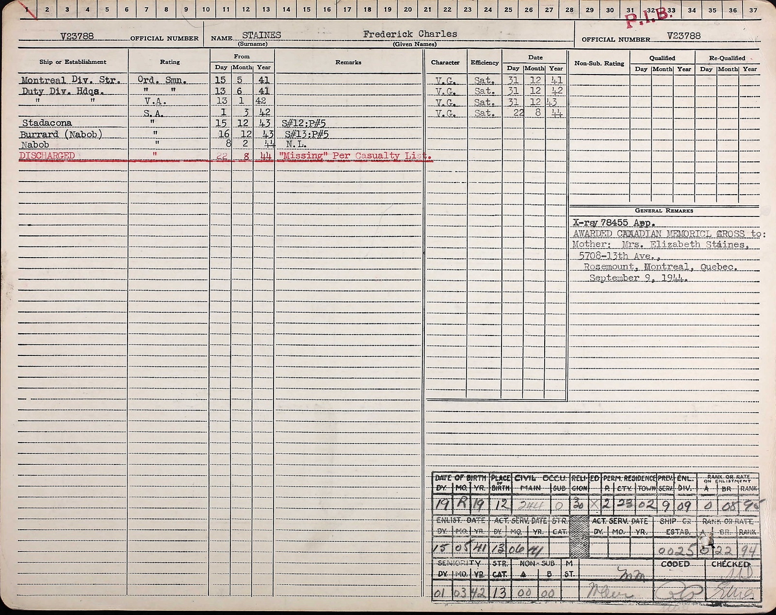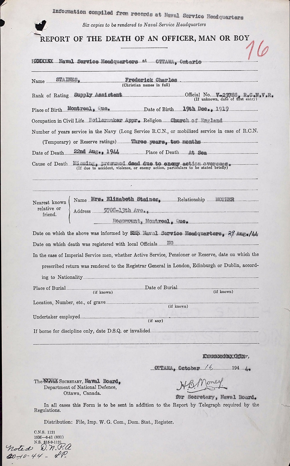 STAINES, Frederick Charles, SA, V23788, RCNVR, MPK - 22 Aug 1944, HMS NABOB - Son of John and Elizabeth Staines, of Montreal, QC.