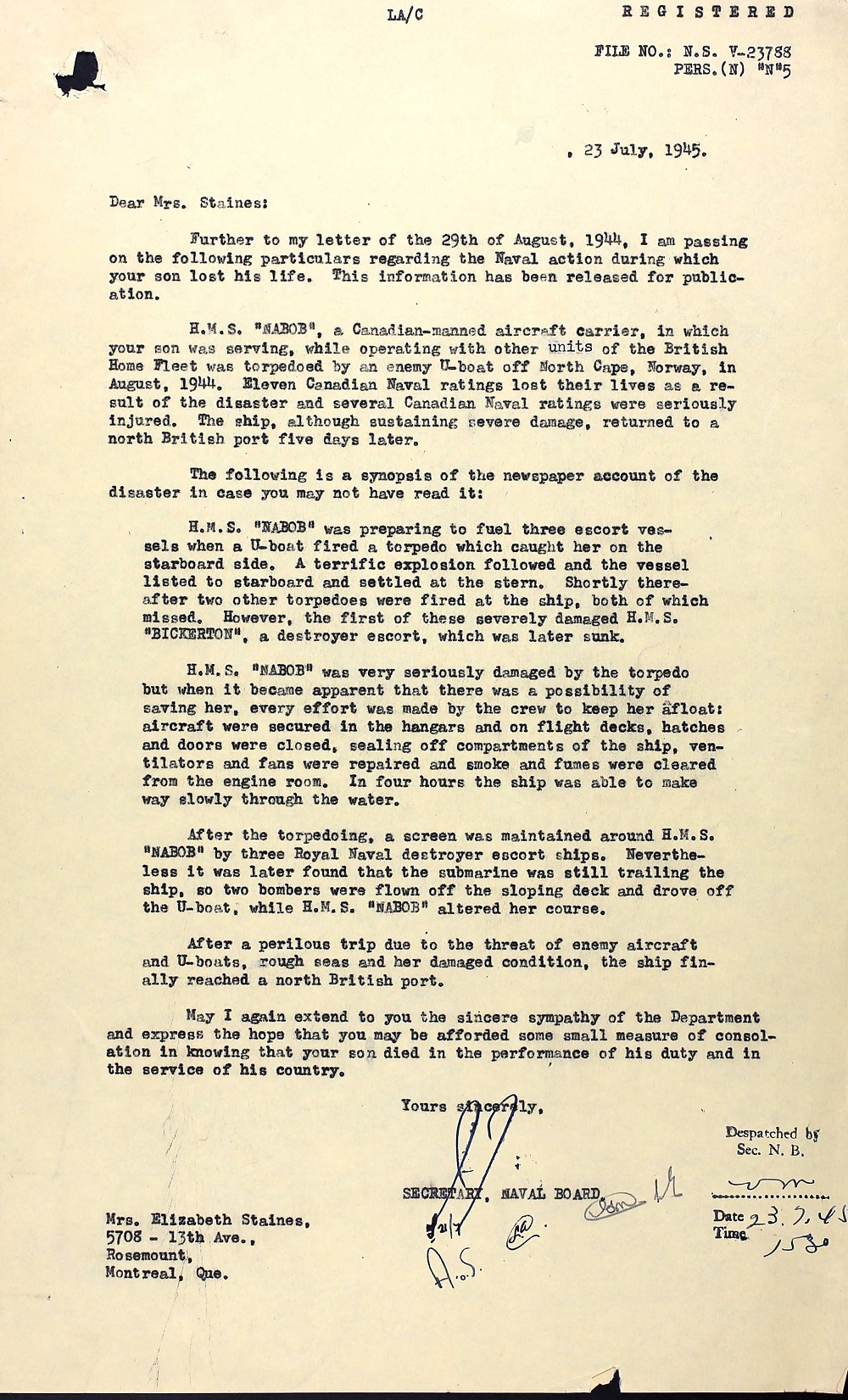 SA Staines died when his ship, HMS NABOB, was hit by a torpedo from U-354 which resulted in the loss of 21 of NABOB'S crew. NABOB made it back to port but was never repaired. She was later paid off and sold for scrap.